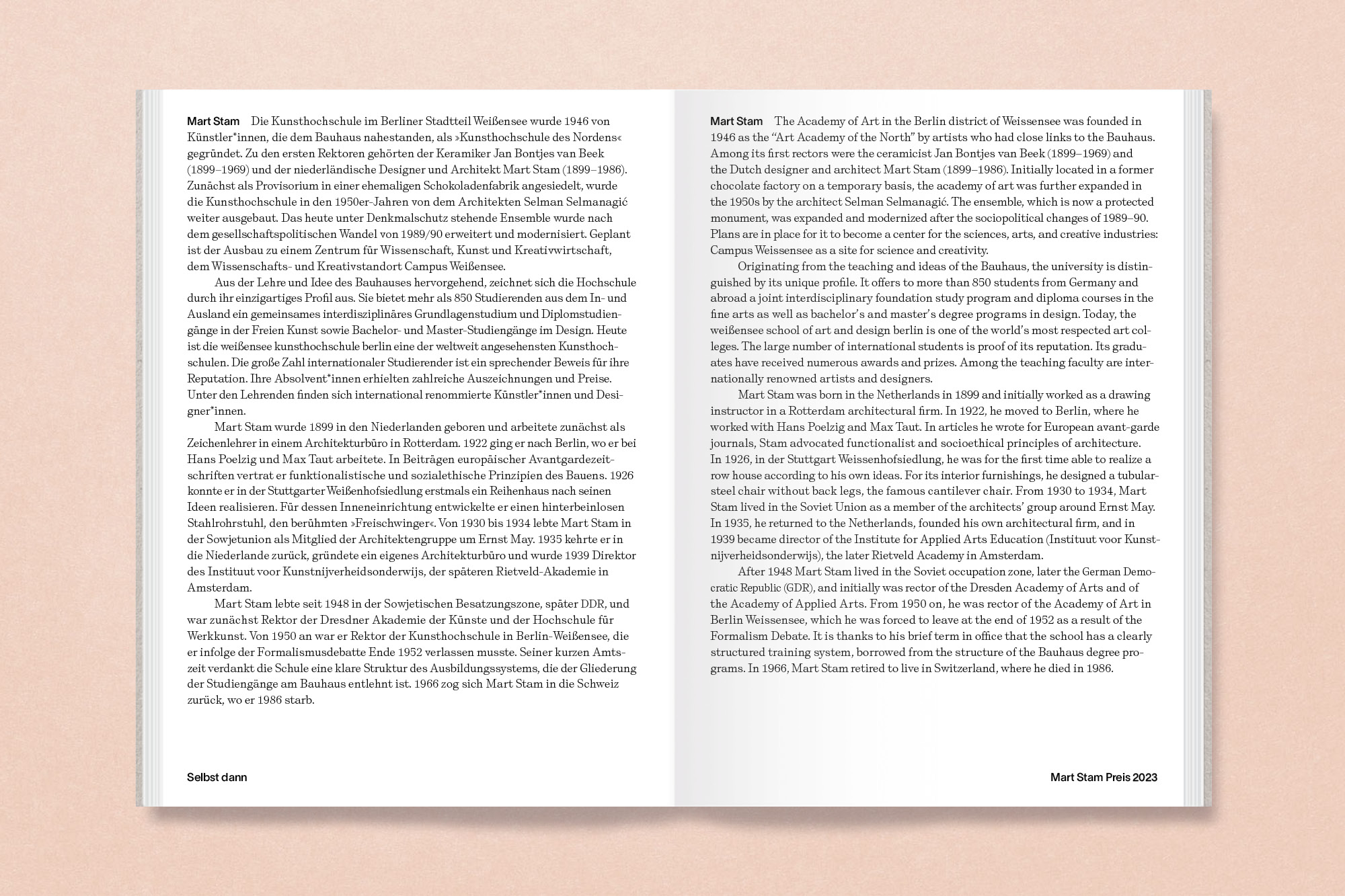 Seit 1997 prämiert die Mart Stam Gesellschaft jedes Jahr die besten Abschlussarbeiten der weißensee kunsthochschule berlin. Studierende aller Fachrichtungen der Freien Kunst und aus den Designdisziplinen können sich um den Mart Stam Preis bewerben, die Entscheidung trifft eine unabhängige Jury. Der Preis besteht in der Kuratierung einer gemeinsamen Ausstellung und der Herausgabe des vorliegenden Katalogs. Die Mart Stam Gesellschaft fördert so junge Künstler*innen und Designer*innen während des Studiums und begleitet ihren Start in die Berufspraxis.