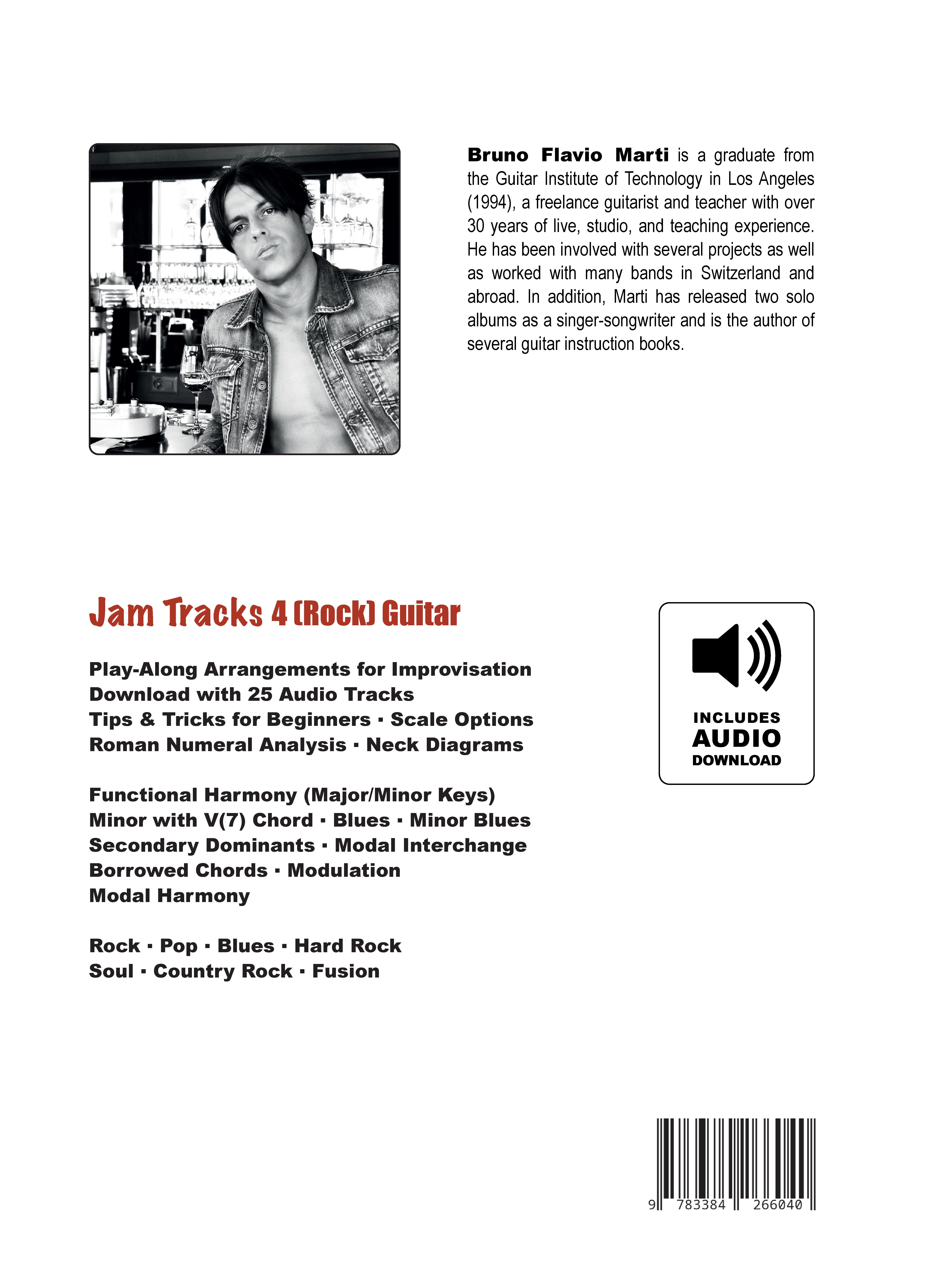 Jam Tracks 4 (Rock) Guitar Play-Along Arrangements for Improvisation With Tips and Tricks for Beginners Jam Tracks 4 (Rock) Guitar consists of 25 instrumental play-along arrangements for improvisation with an electric guitar. Included for each track are the chart with the chord symbols, the roman numeral analysis as well as recommendations in terms of note choices and scale options. With regards to the used tonalities, the tracks fall within the categories of functional harmony (major/minor keys), blues, and modal harmony. Stylistically, they cover genres such as rock, pop, blues, hard rock, soul, country rock, and fusion.