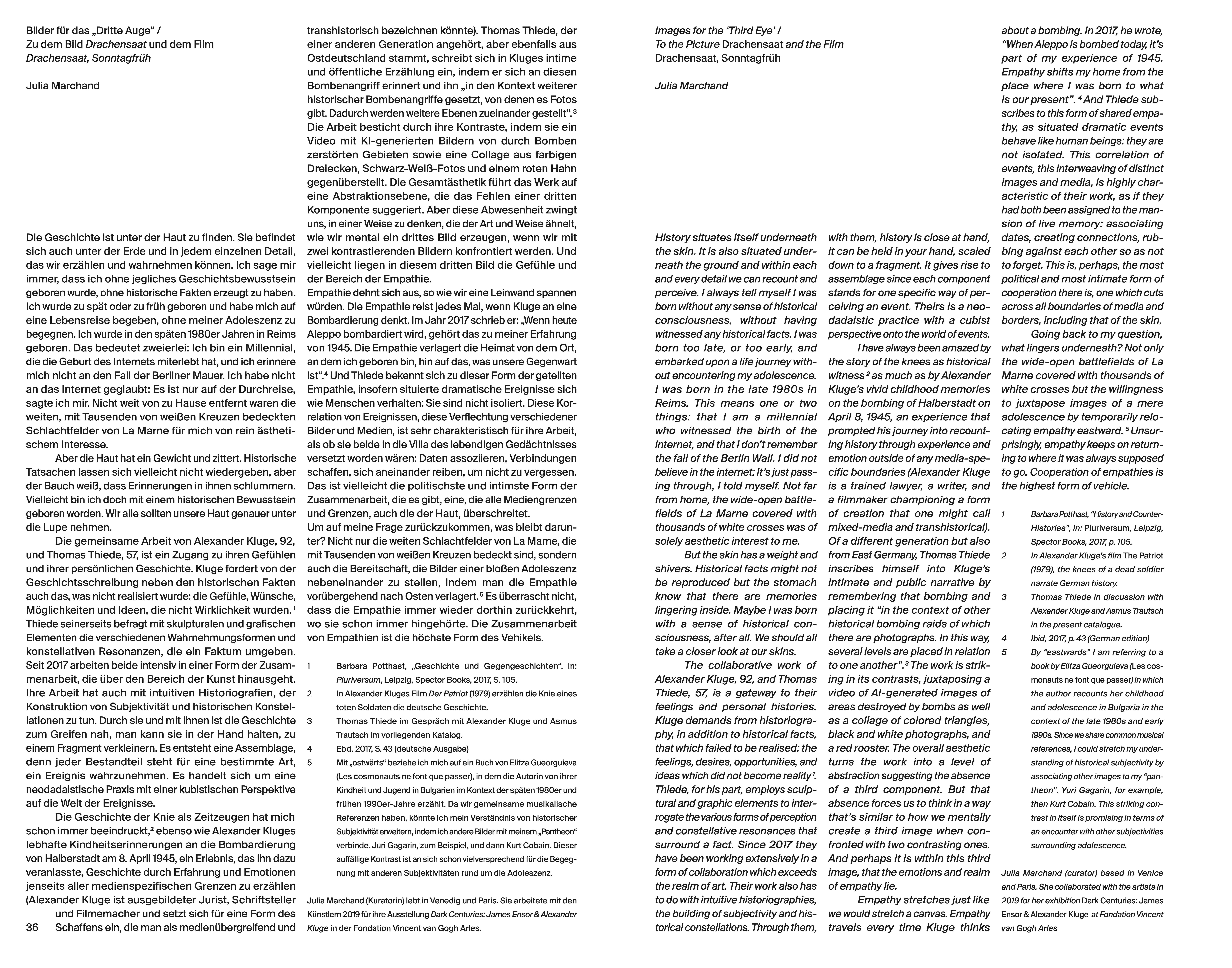 Thomas Thiede's (b. Plauen, 1967; lives and works in Fischbachau and Hamburg) oeuvre can be divided into two strands: one consists of drawings and installations, the other of joint projects with collaborators like the filmmaker, writer, philosopher, and annalist Alexander Kluge (b. Halberstadt, 1932; lives and works in Munich).