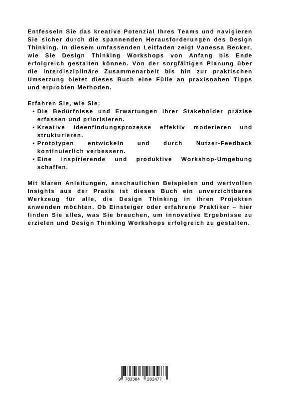 Entfesseln Sie das kreative Potenzial Ihres Teams und navigieren Sie sicher durch die spannenden Herausforderungen des Design Thinking. In diesem umfassenden Leitfaden zeigt Vanessa Becker, wie Sie Design Thinking Workshops von Anfang bis Ende erfolgreich gestalten können. Von der sorgfältigen Planung über die interdisziplinäre Zusammenarbeit bis hin zur praktischen Umsetzung bietet dieses Buch eine Fülle an praxisnahen Tipps und erprobten Methoden.Erfahren Sie, wie Sie:Die Bedürfnisse und Erwartungen Ihrer Stakeholder präzise erfassen und priorisieren.Kreative Ideenfindungsprozesse effektiv moderieren und strukturieren.Prototypen entwickeln und durch Nutzer-Feedback kontinuierlich verbessern.Eine inspirierende und produktive Workshop-Umgebung schaffen.Mit klaren Anleitungen, anschaulichen Beispielen und wertvollen Insights aus der Praxis ist dieses Buch ein unverzichtbares Werkzeug für alle, die Design Thinking in ihren Projekten anwenden möchten. Ob Einsteiger oder erfahrene Praktiker - hier finden Sie alles, was Sie brauchen, um innovative Ergebnisse zu erzielen und Design Thinking Workshops erfolgreich zu gestalten.