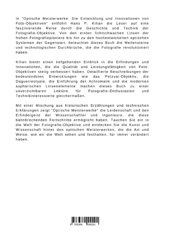 In "Optische Meisterwerke: Die Entwicklung und Innovationen von Foto-Objektiven" entführt Hans P. Kilian die Leser auf eine faszinierende Reise durch die Geschichte und Technik der Fotografie-Objektive. Von den ersten lichtschwachen Linsen der frühen Fotografiepioniere bis hin zu den hochentwickelten optischen Systemen der Gegenwart, beleuchtet dieses Buch die Meilensteine und technologischen Durchbrüche, die die Fotografie revolutioniert haben.Kilian bietet einen tiefgehenden Einblick in die Erfindungen und Innovationen, die die Qualität und Leistungsfähigkeit von Foto-Objektiven stetig verbessert haben. Detaillierte Beschreibungen der bedeutendsten Entwicklungen wie das Petzval-Objektiv, die Daguerreotypie, die Einführung der Achromatik und die modernen asphärischen Linsenelemente machen dieses Buch zu einer unverzichtbaren Lektüre für Fotografie-Enthusiasten und Technikinteressierte gleichermaßen.Mit einer Mischung aus historischen Erzählungen und technischen Erklärungen zeigt "Optische Meisterwerke" die Leidenschaft und den Erfindergeist der Wissenschaftler und Ingenieure, die diese bahnbrechenden Fortschritte ermöglicht haben. Tauchen Sie ein in die Welt der Fotografie-Objektive und entdecken Sie die Kunst und Wissenschaft hinter den optischen Meisterwerken, die die Art und Weise, wie wir die Welt sehen und festhalten, für immer verändert haben.