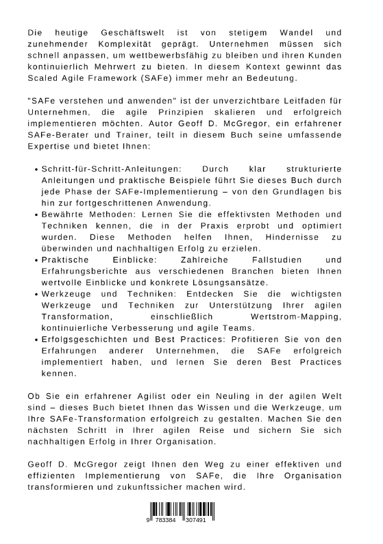 Die heutige Geschäftswelt ist von stetigem Wandel und zunehmender Komplexität geprägt. Unternehmen müssen sich schnell anpassen, um wettbewerbsfähig zu bleiben und ihren Kunden kontinuierlich Mehrwert zu bieten. In diesem Kontext gewinnt das Scaled Agile Framework (SAFe) immer mehr an Bedeutung."SAFe verstehen und anwenden" ist der unverzichtbare Leitfaden für Unternehmen, die agile Prinzipien skalieren und erfolgreich implementieren möchten. Autor Geoff D. McGregor, ein erfahrener SAFe-Berater und Trainer, teilt in diesem Buch seine umfassende Expertise und bietet Ihnen:Schritt-für-Schritt-Anleitungen: Durch klar strukturierte Anleitungen und praktische Beispiele führt Sie dieses Buch durch jede Phase der SAFe-Implementierung - von den Grundlagen bis hin zur fortgeschrittenen Anwendung.Bewährte Methoden: Lernen Sie die effektivsten Methoden und Techniken kennen, die in der Praxis erprobt und optimiert wurden. Diese Methoden helfen Ihnen, Hindernisse zu überwinden und nachhaltigen Erfolg zu erzielen.Praktische Einblicke: Zahlreiche Fallstudien und Erfahrungsberichte aus verschiedenen Branchen bieten Ihnen wertvolle Einblicke und konkrete Lösungsansätze.Werkzeuge und Techniken: Entdecken Sie die wichtigsten Werkzeuge und Techniken zur Unterstützung Ihrer agilen Transformation, einschließlich Wertstrom-Mapping, kontinuierliche Verbesserung und agile Teams.Erfolgsgeschichten und Best Practices: Profitieren Sie von den Erfahrungen anderer Unternehmen, die SAFe erfolgreich implementiert haben, und lernen Sie deren Best Practices kennen.Ob Sie ein erfahrener Agilist oder ein Neuling in der agilen Welt sind - dieses Buch bietet Ihnen das Wissen und die Werkzeuge, um Ihre SAFe-Transformation erfolgreich zu gestalten. Machen Sie den nächsten Schritt in Ihrer agilen Reise und sichern Sie sich nachhaltigen Erfolg in Ihrer Organisation.Geoff D. McGregor zeigt Ihnen den Weg zu einer effektiven und effizienten Implementierung von SAFe, die Ihre Organisation transformieren und zukunftssicher machen wird.