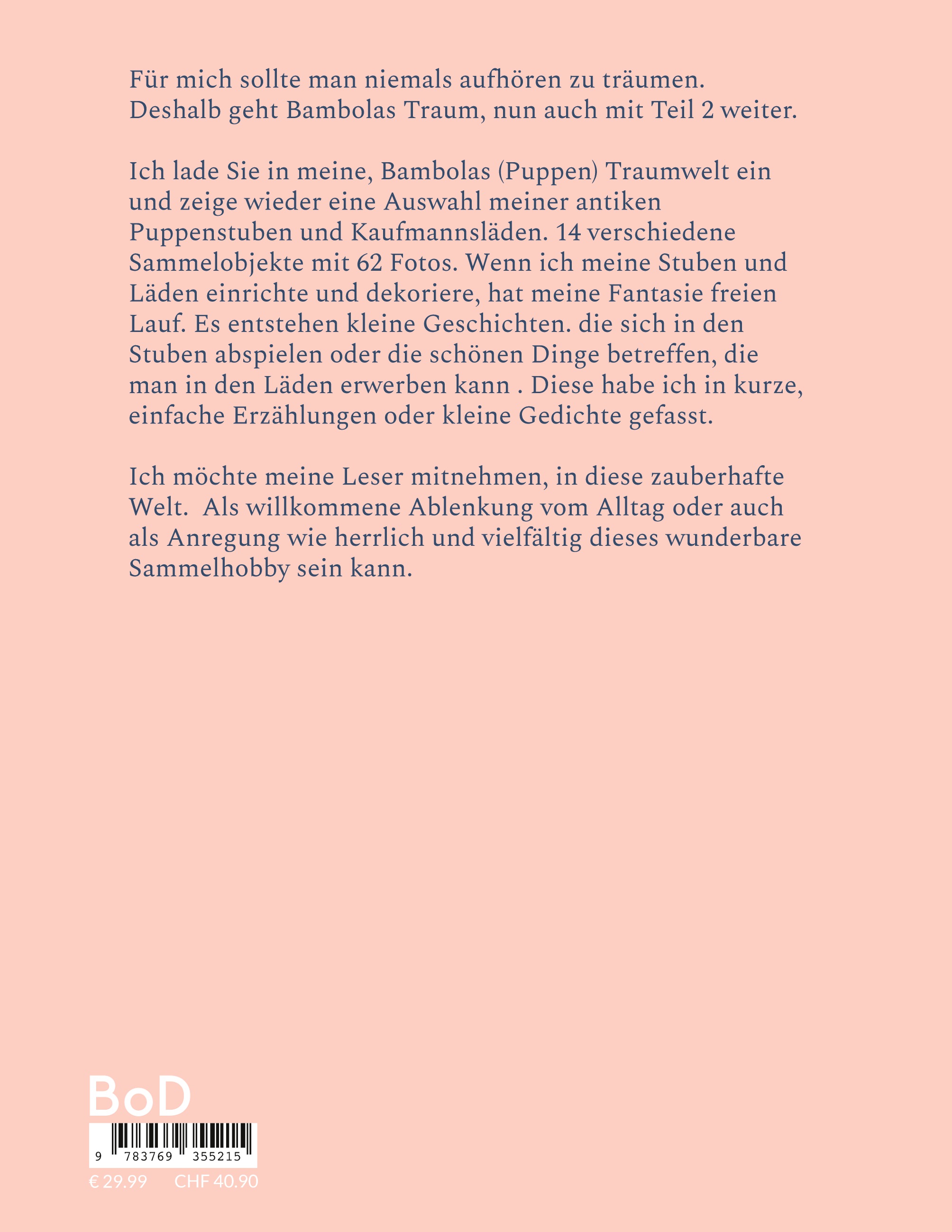 Da man nie aufhören sollte zu träumen, geht nach Bambolas Traum nun der Traum mit Teil 2 weiter. Wieder eine Auswahl meiner antiken Puppenstuben und Kaufmannsläden. 14 verschiedene Sammelobjekte mit 52 Fotos. Dazu kurze, einfache Geschichten oder Gedichte, die sich in den Stuben abspielen oder die schönen Dinge betreffen, die man in den Kaufläden erwerben kann. Die kleinen Erzählungen sind alle meiner Fantasie entsprungen, wenn ich meine Stuben und Löden einrichte und dekoriere. Ich möchte meine Leser mitnehmen, in diese kleine, heile Welt. In Bambolas (Puppen) Traumwelt. Als Ablenkung vom Alltag oder auch als Anregung wie herrlich dieses wunderbare Sammelhobby sein kann.