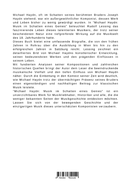 Michael Haydn, oft im Schatten seines berühmten Bruders Joseph Haydn stehend, war ein außergewöhnlicher Komponist, dessen Werk und Leben bisher zu wenig gewürdigt wurden. In "Michael Haydn: Musik im Schatten eines Genies" beleuchtet Rudolf Lessing das faszinierende Leben dieses talentierten Musikers, der trotz seiner bescheidenen Natur eine tiefgreifende Wirkung auf die Musikwelt des 18. Jahrhunderts hatte.Dieses Buch bietet eine umfassende Biografie, die von den frühen Jahren in Rohrau über die Ausbildung in Wien bis hin zu den erfolgreichen Jahren in Salzburg reicht. Lessing zeichnet ein detailliertes Bild von Michael Haydns künstlerischer Entwicklung, seinen bedeutendsten Werken und den prägenden Einflüssen in seinem Leben.Mit fundierten Analysen seiner Kompositionen und zahlreichen historischen Quellen bringt der Autor dem Leser die beeindruckende musikalische Vielfalt und den tiefen Einfluss von Michael Haydn näher. Durch die Einbettung in den Kontext seiner Zeit wird deutlich, wie Michael Haydn trotz der übermächtigen Präsenz seines Bruders einen eigenständigen und nachhaltigen Beitrag zur klassischen Musik leistete."Michael Haydn: Musik im Schatten eines Genies" ist ein unverzichtbares Werk für Musikliebhaber, Historiker und alle, die die weniger bekannten Seiten der Musikgeschichte entdecken möchten. Lassen Sie sich von der bewegenden Geschichte und der einzigartigen Musik dieses unterschätzten Komponisten verzaubern.