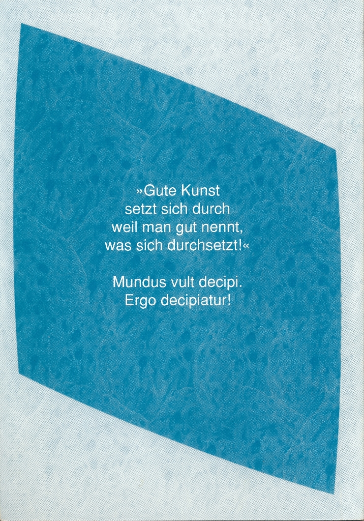 Wenn Hegel geahnt hätte, wie grauenhaft sein dialektischer Mechanismus Wirklichkeit wird, zum Laufplan und zur Wahrnehmungsschablone eines schrecklich durchgeregelten Nationalrationalismus, dann hätte er sich vielleicht doch lieber fürs Vielerlei und gegen den Fortschritt entschieden. [.]Im Fenster meiner Stammkneipe steht ein Schild mit deutlicher Schrift: "Unsere Automaten werden täglich gelehrt!" Das nenne ich Offenheit! Das ist Informationsgesellschaft."Gute Kunst setzt sich durch, weil man gut nennt, was sich durchsetzt! Mundus vult decipi, Ergo decipiatur!"