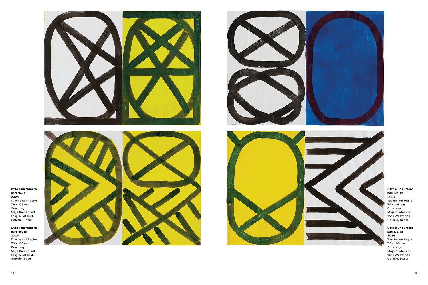 Das Buch MMXXIV Maja Rieder zeigt Abbildungen der beiden neuen Werkblöcke Otto è un numero pari und Synthesizer (beide 2024). Zudem gibt es Einblicke in Entwurfs- und Skizzenmaterial welche den Arbeitsprozess der Künstlerin veranschaulichen.Über die Arbeiten der letzten vier Jahre informiert der Index im hinteren Teil des Buches.Das Bildmaterial wird durch zwei Texte (Deut. / Engl.) ergänzt, einen Essay von Anita Haldemann, Leiterin Kupferstichkabinett Basel und ein Gespräch zwischen der Künstlerin und Linda Schädler, Leiterin der graphischen Sammlung der ETH Zürich.Das Prozesshafte ist mir sehr wichtig. Ich zeichne, wie Du sagst, im Normalfall am Boden, wobei ich nicht nur an einem Blatt, sondern parallel an vielen Blättern arbeite. Das heisst, dass ich einige Striche auf ein Werk setze, zum nächsten gehe und dort weiterarbeite und so weiter, bis ich wieder beim ersten ankomme und dort weiterzeichne. Ich führe also gleichzeitig mehrere Werke aus. So können die verschiedenen Schichten trocknen. Doch eigentlich geht es mir vor allem darum, nicht vorab gedanklich alles durchdacht oder gar bis ins Detail konstruiert zu haben. Ich suche das Absichtslose. Daher kommt mir dieser rasche Prozess sehr entgegen. (Aus dem Gespräch zwischen Maja Rieder und Linda Schädler).