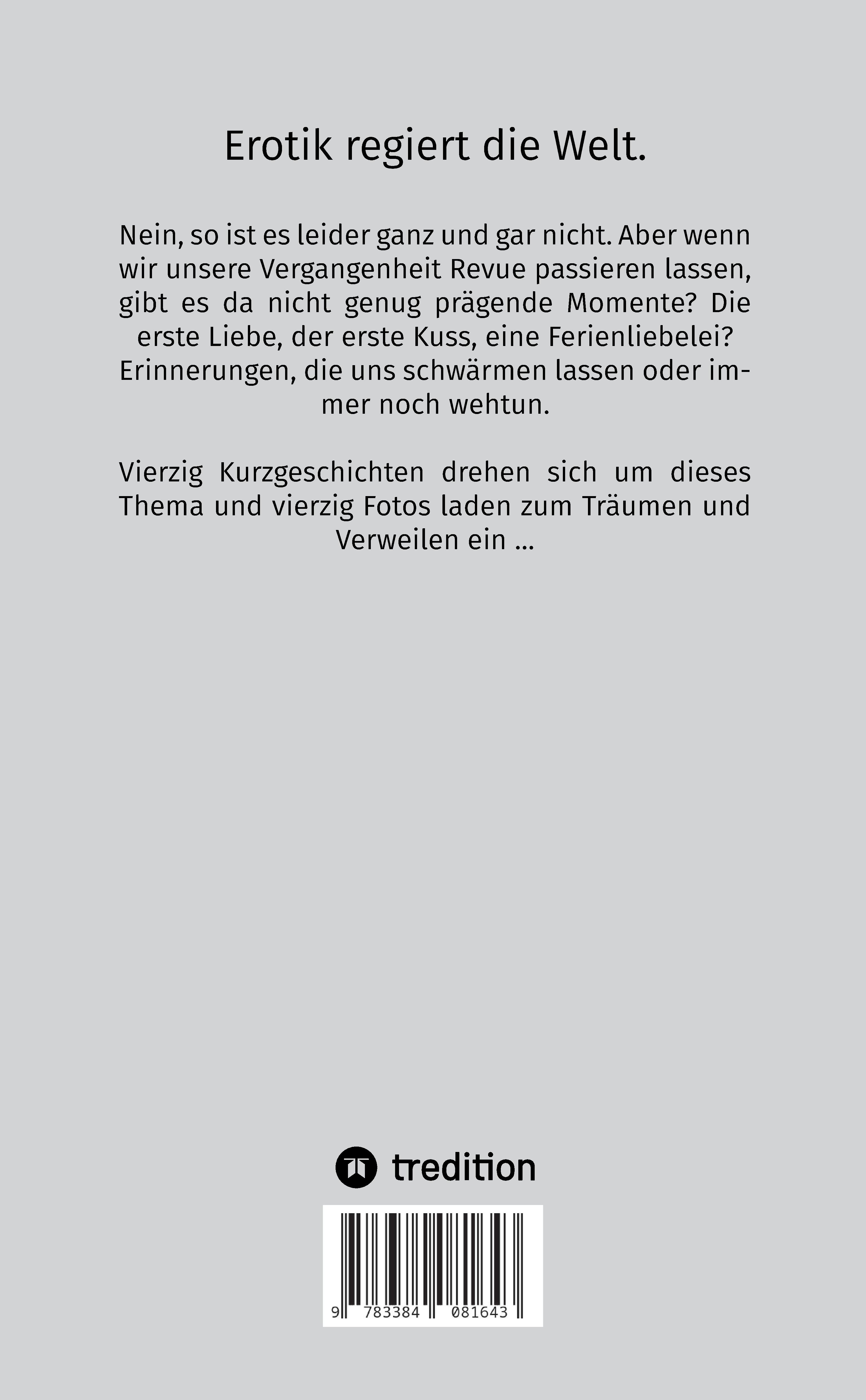 Erotik regiert die Welt. Nein, so ist es leider ganz und gar nicht. Aber wenn wir unsere Vergangenheit Revue passieren lassen, gibt es da nicht genug prägende Momente? Die erste Liebe, der erste Kuss, eine Ferienliebelei? Erinnerungen, die uns schwärmen lassen oder immer noch wehtun. Vierzig Kurzgeschichten drehen sich um dieses Thema und vierzig Fotos laden zum Träumen und Verweilen ein ...