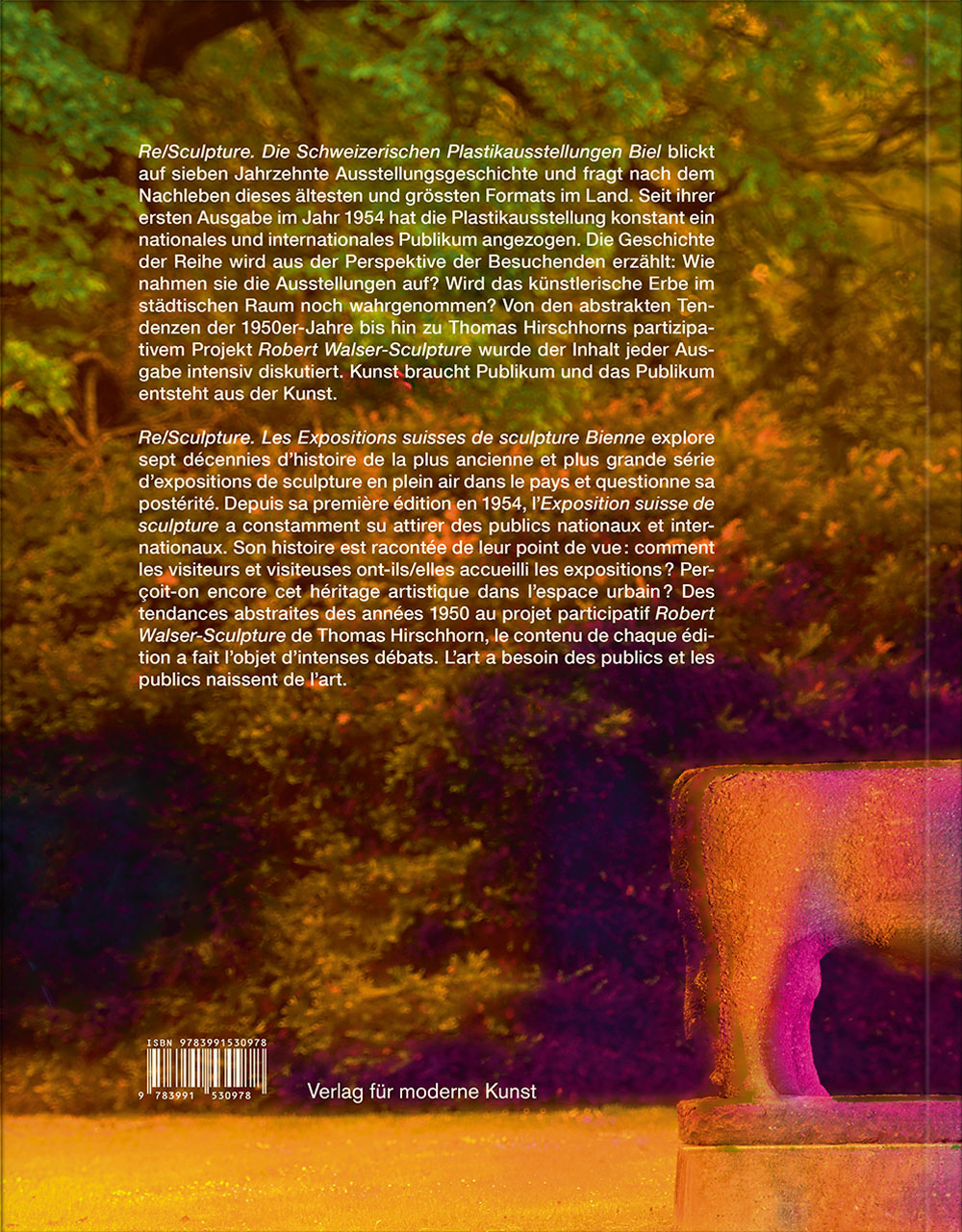 Re/Sculpture. Die Schweizerischen Plastikausstellungen Biel blickt auf sieben Jahrzehnte Ausstellungsgeschichte und fragt nach dem Nachleben dieses ältesten und größten Formats im Land. Seit ihrer ersten Ausgabe im Jahr 1954 hat die Plastikausstellung konstant ein nationales und internationales Publikum angezogen. Die Geschichte der Reihe wird aus der Perspektive der Besuchenden erzählt: Wie nahmen sie die Ausstellungen auf? Wird das künstlerische Erbe im städtischen Raum noch wahrgenommen? Von den abstrakten Tendenzen der 1950er-Jahre bis hin zu Thomas Hirschhorns partizipativem Projekt Robert Walser-Sculpture wurde der Inhalt jeder Ausgabe intensiv diskutiert. Kunst braucht Publikum und das Publikum entsteht aus der Kunst.