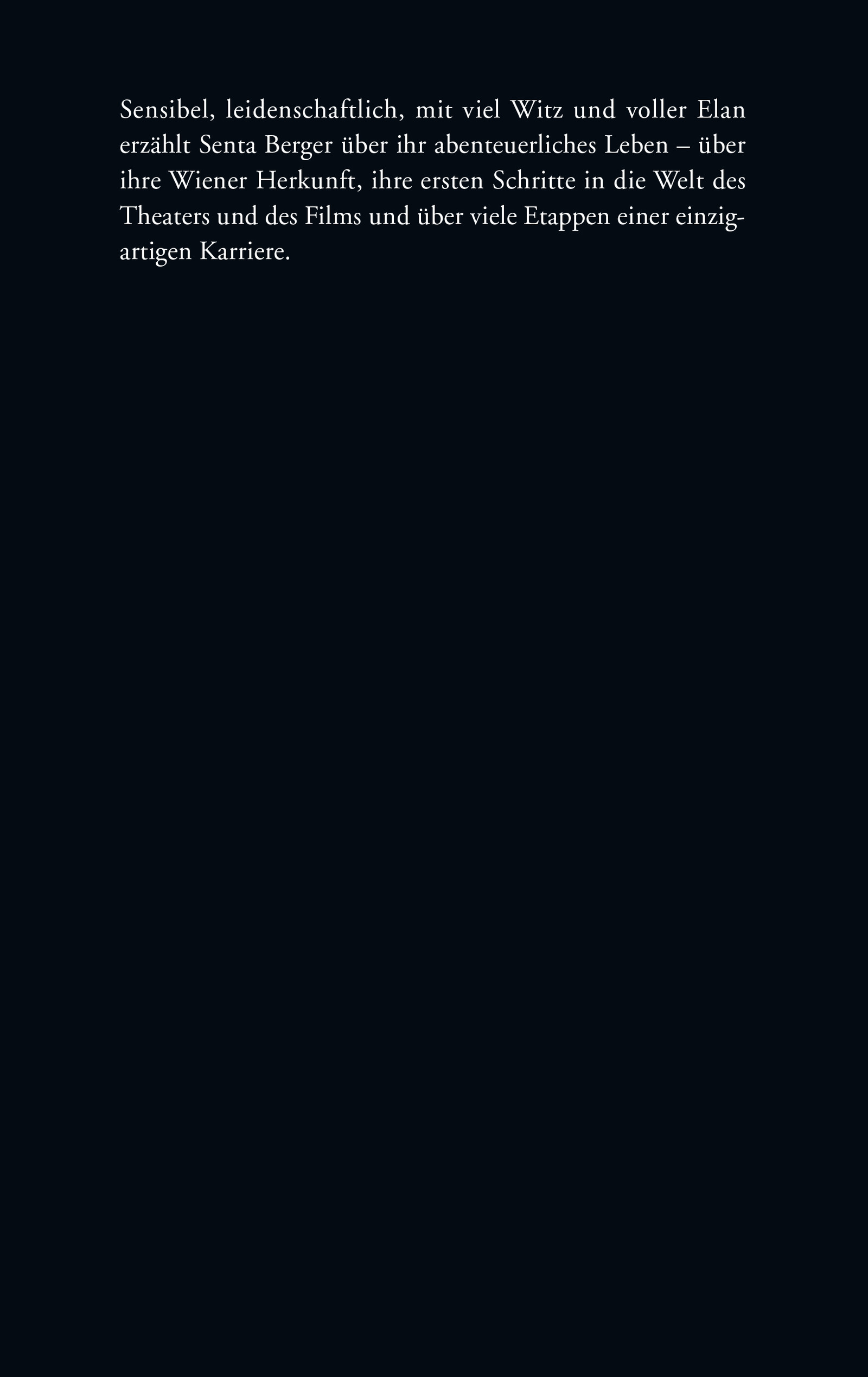 Seit Langem hat man darauf gewartet: Senta Berger, Deutschlands beliebteste und populärste Schauspielerin, hat ein Buch über ihr Leben geschrieben: über ihre Kindheit und Jugend im Wien der Nachkriegszeit, über ihre Familie, über ihre Karriere als Schauspielerin in Österreich, Deutschland, in Hollywood und Italien. Über das Theater, den Film und das Fernsehen. Über Freunde und Kollegen.