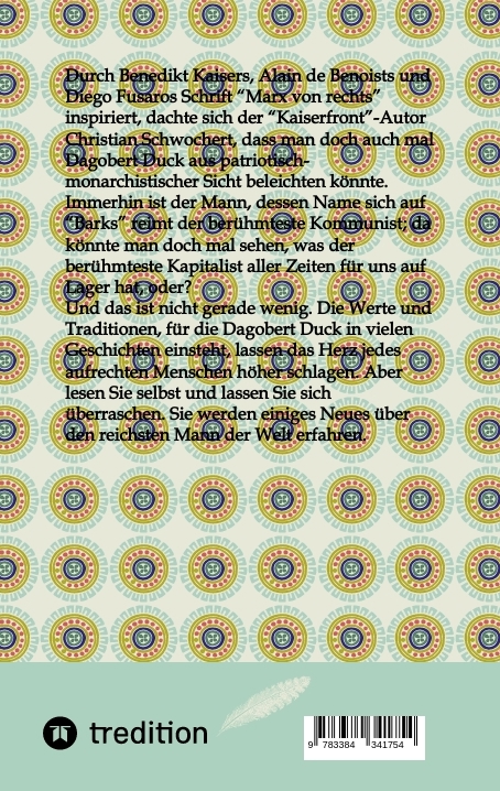 Durch Benedikt Kaisers, Alain de Benoists und Diego Fusaros Schrift "Marx von rechts" inspiriert, dachte sich der "Kaiserfront"-Autor Christian Schwochert, dass man doch auch mal Dagobert Duck aus patriotisch-monarchistischer Sicht beleichten könnte. Immerhin ist der Mann, dessen Name sich auf "Barks" reimt der berühmteste Kommunist; da könnte man doch mal sehen, was der berühmteste Kapitalist aller Zeiten für uns auf Lager hat, oder?Und das ist nicht gerade wenig. Die Werte und Traditionen, für die Dagobert Duck in vielen Geschichten einsteht, lassen das Herz jedes aufrechten Menschen höher schlagen. Aber lesen Sie selbst und lassen Sie sich überraschen. Sie werden einiges Neues über den reichsten Mann der Welt erfahren.