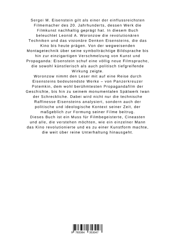 Sergei M. Eisenstein gilt als einer der einflussreichsten Filmemacher des 20. Jahrhunderts, dessen Werk die Filmkunst nachhaltig geprägt hat. In diesem Buch beleuchtet Leonid A. Woronzow die revolutionären Techniken und das visionäre Denken Eisensteins, die das Kino bis heute prägen. Von der wegweisenden Montagetechnik über seine symbolträchtige Bildsprache bis hin zur einzigartigen Verschmelzung von Kunst und Propaganda: Eisenstein schuf eine völlig neue Filmsprache, die sowohl künstlerisch als auch politisch tiefgreifende Wirkung zeigte.Woronzow nimmt den Leser mit auf eine Reise durch Eisensteins bedeutendste Werke - von Panzerkreuzer Potemkin, dem wohl berühmtesten Propagandafilm der Geschichte, bis hin zu seinem monumentalen Spätwerk Iwan der Schreckliche. Dabei wird nicht nur die technische Raffinesse Eisensteins analysiert, sondern auch der politische und ideologische Kontext seiner Zeit, der maßgeblich zur Formung seiner Filme beitrug.Dieses Buch ist ein Muss für Filmbegeisterte, Cineasten und alle, die verstehen möchten, wie ein einzelner Mann das Kino revolutionierte und es zu einer Kunstform machte, die weit über reine Unterhaltung hinausgeht.