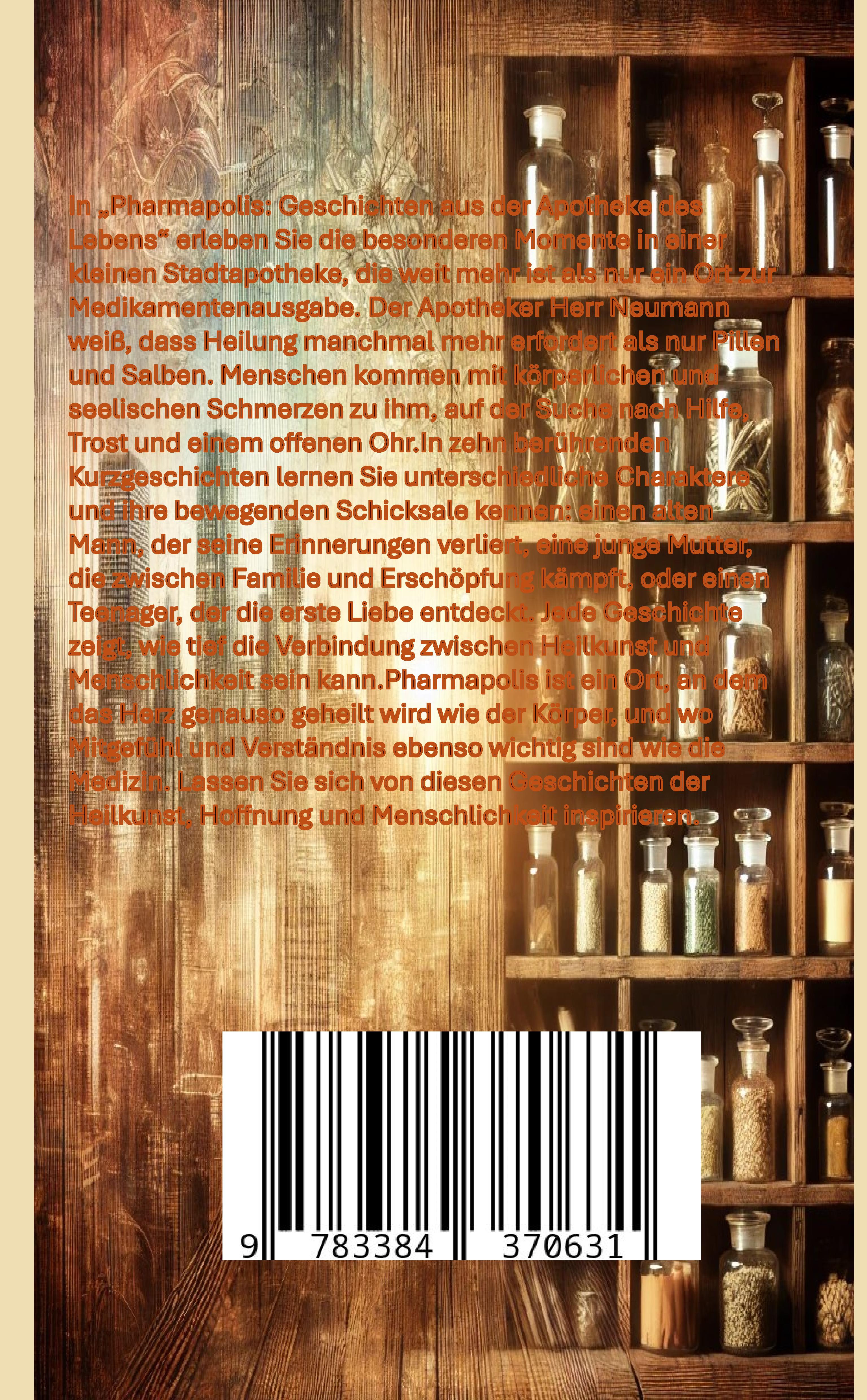 Tauchen Sie ein in die Welt von "Pharmapolis - Geschichten aus der Apotheke des Lebens". In dieser faszinierenden Sammlung von Erzählungen nimmt Sie der Apotheker Herr Neumann mit auf eine Reise durch die Tiefen des Alltags und die Geheimnisse der Heilkunst. Jede Geschichte enthüllt das Zusammenspiel von modernen Medikamenten und traditionellen Heilmethoden, während die Kunden der Apotheke nicht nur körperliche, sondern auch seelische Heilung suchen.Von einem alten Mann, der seine Erinnerungen verliert, bis zu einer gestressten Managerin, die im Duft der Heilung neue Kraft findet - die Geschichten in "Pharmapolis" erzählen von menschlichen Schicksalen, die alle auf ihre Weise Heilung suchen und finden. Begleiten Sie Herr Neumann und seine Apotheke, wo nicht nur Medikamente, sondern auch Weisheit und Mitgefühl im Mittelpunkt stehen.Für Liebhaber von emotionalen, tiefgründigen Geschichten und solche, die an die heilende Kraft menschlicher Begegnungen glauben, ist dieses Buch eine wahre Fundgrube an Inspiration und Nachdenklichkeit.Leserstimmen:"Ein Buch, das nicht nur berührt, sondern zum Nachdenken anregt. Die Apotheke wird zum Symbol für Heilung und Gemeinschaft.