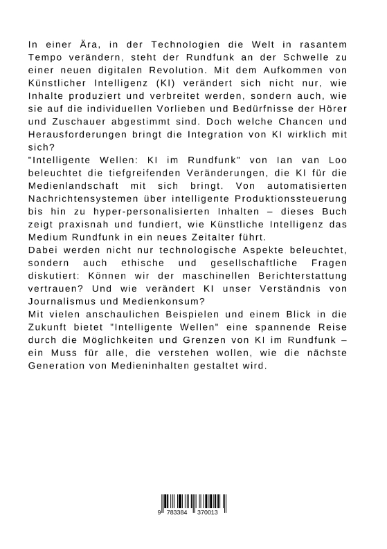 In einer Ära, in der Technologien die Welt in rasantem Tempo verändern, steht der Rundfunk an der Schwelle zu einer neuen digitalen Revolution. Mit dem Aufkommen von Künstlicher Intelligenz (KI) verändert sich nicht nur, wie Inhalte produziert und verbreitet werden, sondern auch, wie sie auf die individuellen Vorlieben und Bedürfnisse der Hörer und Zuschauer abgestimmt sind. Doch welche Chancen und Herausforderungen bringt die Integration von KI wirklich mit sich?"Intelligente Wellen: KI im Rundfunk" von Ian van Loo beleuchtet die tiefgreifenden Veränderungen, die KI für die Medienlandschaft mit sich bringt. Von automatisierten Nachrichtensystemen über intelligente Produktionssteuerung bis hin zu hyper-personalisierten Inhalten - dieses Buch zeigt praxisnah und fundiert, wie Künstliche Intelligenz das Medium Rundfunk in ein neues Zeitalter führt.Dabei werden nicht nur technologische Aspekte beleuchtet, sondern auch ethische und gesellschaftliche Fragen diskutiert: Können wir der maschinellen Berichterstattung vertrauen? Und wie verändert KI unser Verständnis von Journalismus und Medienkonsum?Mit vielen anschaulichen Beispielen und einem Blick in die Zukunft bietet "Intelligente Wellen" eine spannende Reise durch die Möglichkeiten und Grenzen von KI im Rundfunk - ein Muss für alle, die verstehen wollen, wie die nächste Generation von Medieninhalten gestaltet wird.