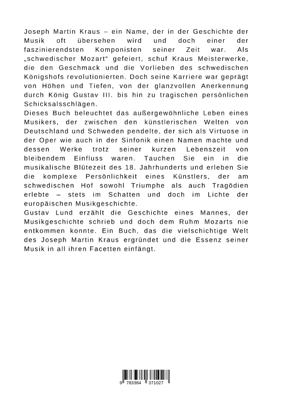 Joseph Martin Kraus - ein Name, der in der Geschichte der Musik oft übersehen wird und doch einer der faszinierendsten Komponisten seiner Zeit war. Als "schwedischer Mozart" gefeiert, schuf Kraus Meisterwerke, die den Geschmack und die Vorlieben des schwedischen Königshofs revolutionierten. Doch seine Karriere war geprägt von Höhen und Tiefen, von der glanzvollen Anerkennung durch König Gustav III. bis hin zu tragischen persönlichen Schicksalsschlägen.Dieses Buch beleuchtet das außergewöhnliche Leben eines Musikers, der zwischen den künstlerischen Welten von Deutschland und Schweden pendelte, der sich als Virtuose in der Oper wie auch in der Sinfonik einen Namen machte und dessen Werke trotz seiner kurzen Lebenszeit von bleibendem Einfluss waren. Tauchen Sie ein in die musikalische Blütezeit des 18. Jahrhunderts und erleben Sie die komplexe Persönlichkeit eines Künstlers, der am schwedischen Hof sowohl Triumphe als auch Tragödien erlebte - stets im Schatten und doch im Lichte der europäischen Musikgeschichte.Gustav Lund erzählt die Geschichte eines Mannes, der Musikgeschichte schrieb und doch dem Ruhm Mozarts nie entkommen konnte. Ein Buch, das die vielschichtige Welt des Joseph Martin Kraus ergründet und die Essenz seiner Musik in all ihren Facetten einfängt.