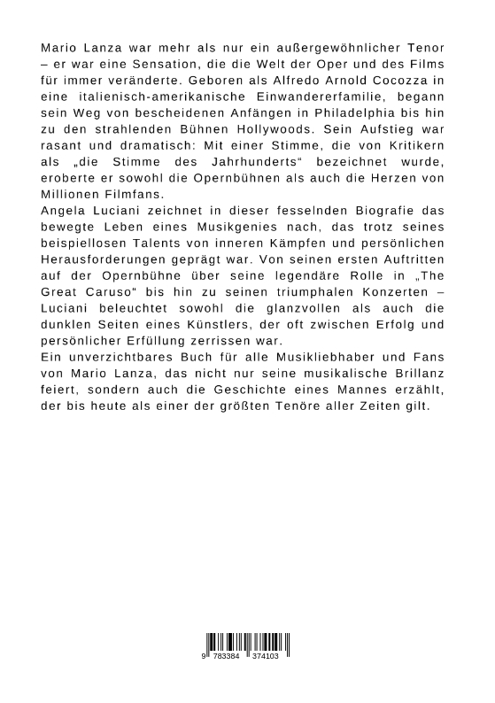 Mario Lanza war mehr als nur ein außergewöhnlicher Tenor - er war eine Sensation, die die Welt der Oper und des Films für immer veränderte. Geboren als Alfredo Arnold Cocozza in eine italienisch-amerikanische Einwandererfamilie, begann sein Weg von bescheidenen Anfängen in Philadelphia bis hin zu den strahlenden Bühnen Hollywoods. Sein Aufstieg war rasant und dramatisch: Mit einer Stimme, die von Kritikern als "die Stimme des Jahrhunderts" bezeichnet wurde, eroberte er sowohl die Opernbühnen als auch die Herzen von Millionen Filmfans.Angela Luciani zeichnet in dieser fesselnden Biografie das bewegte Leben eines Musikgenies nach, das trotz seines beispiellosen Talents von inneren Kämpfen und persönlichen Herausforderungen geprägt war. Von seinen ersten Auftritten auf der Opernbühne über seine legendäre Rolle in "The Great Caruso" bis hin zu seinen triumphalen Konzerten - Luciani beleuchtet sowohl die glanzvollen als auch die dunklen Seiten eines Künstlers, der oft zwischen Erfolg und persönlicher Erfüllung zerrissen war.Ein unverzichtbares Buch für alle Musikliebhaber und Fans von Mario Lanza, das nicht nur seine musikalische Brillanz feiert, sondern auch die Geschichte eines Mannes erzählt, der bis heute als einer der größten Tenöre aller Zeiten gilt.