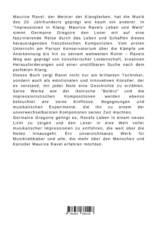 Maurice Ravel, der Meister der Klangfarben, hat die Musik des 20. Jahrhunderts geprägt wie kaum ein anderer. In "Impressionen in Klang: Maurice Ravels Leben und Werk" nimmt Germaine Gregoire den Leser mit auf eine faszinierende Reise durch das Leben und Schaffen dieses herausragenden französischen Komponisten. Vom ersten Unterricht am Pariser Konservatorium über die Kämpfe um Anerkennung bis hin zu seinem weltweiten Ruhm - Ravels Weg war geprägt von künstlerischer Leidenschaft, kreativen Herausforderungen und einer unstillbaren Suche nach dem perfekten Klang.Dieses Buch zeigt Ravel nicht nur als brillanten Techniker, sondern auch als emotionalen und innovativen Künstler, der es verstand, mit jeder Note eine Geschichte zu erzählen. Seine Werke wie der ikonische "Boléro" und die impressionistischen Kompositionen werden ebenso beleuchtet wie seine Einflüsse, Begegnungen und musikalischen Experimente, die ihn zu einem der unverwechselbarsten Komponisten seiner Zeit machten.Germaine Gregoire gelingt es, Ravels Leben in einem neuen Licht zu zeigen und den Leser in eine Welt voller musikalischer Impressionen zu entführen, die weit über die Noten hinausgeht. Ein unverzichtbares Werk für Musikliebhaber und alle, die mehr über den Menschen und Künstler Maurice Ravel erfahren möchten.