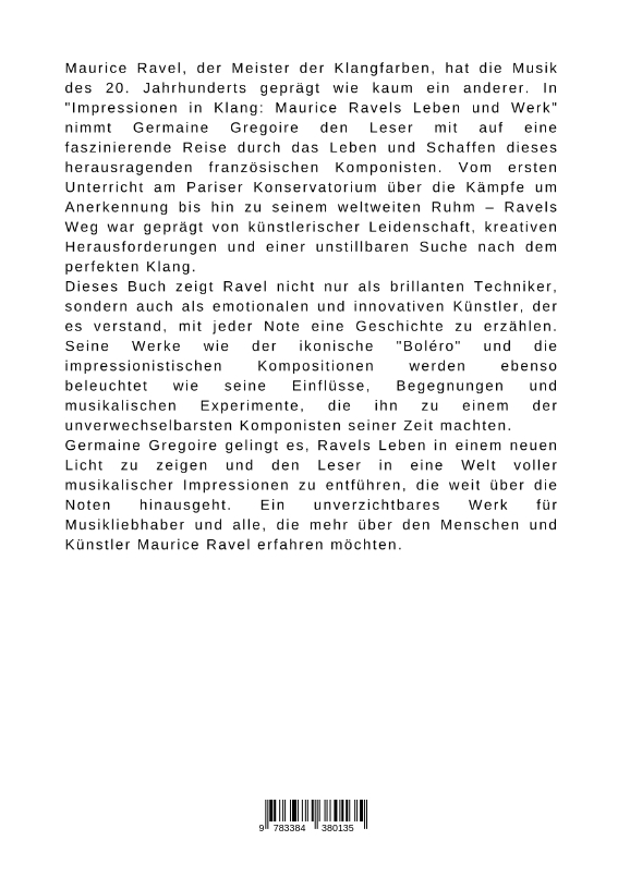 Maurice Ravel, der Meister der Klangfarben, hat die Musik des 20. Jahrhunderts geprägt wie kaum ein anderer. In "Impressionen in Klang: Maurice Ravels Leben und Werk" nimmt Germaine Gregoire den Leser mit auf eine faszinierende Reise durch das Leben und Schaffen dieses herausragenden französischen Komponisten. Vom ersten Unterricht am Pariser Konservatorium über die Kämpfe um Anerkennung bis hin zu seinem weltweiten Ruhm - Ravels Weg war geprägt von künstlerischer Leidenschaft, kreativen Herausforderungen und einer unstillbaren Suche nach dem perfekten Klang.Dieses Buch zeigt Ravel nicht nur als brillanten Techniker, sondern auch als emotionalen und innovativen Künstler, der es verstand, mit jeder Note eine Geschichte zu erzählen. Seine Werke wie der ikonische "Boléro" und die impressionistischen Kompositionen werden ebenso beleuchtet wie seine Einflüsse, Begegnungen und musikalischen Experimente, die ihn zu einem der unverwechselbarsten Komponisten seiner Zeit machten.Germaine Gregoire gelingt es, Ravels Leben in einem neuen Licht zu zeigen und den Leser in eine Welt voller musikalischer Impressionen zu entführen, die weit über die Noten hinausgeht. Ein unverzichtbares Werk für Musikliebhaber und alle, die mehr über den Menschen und Künstler Maurice Ravel erfahren möchten.