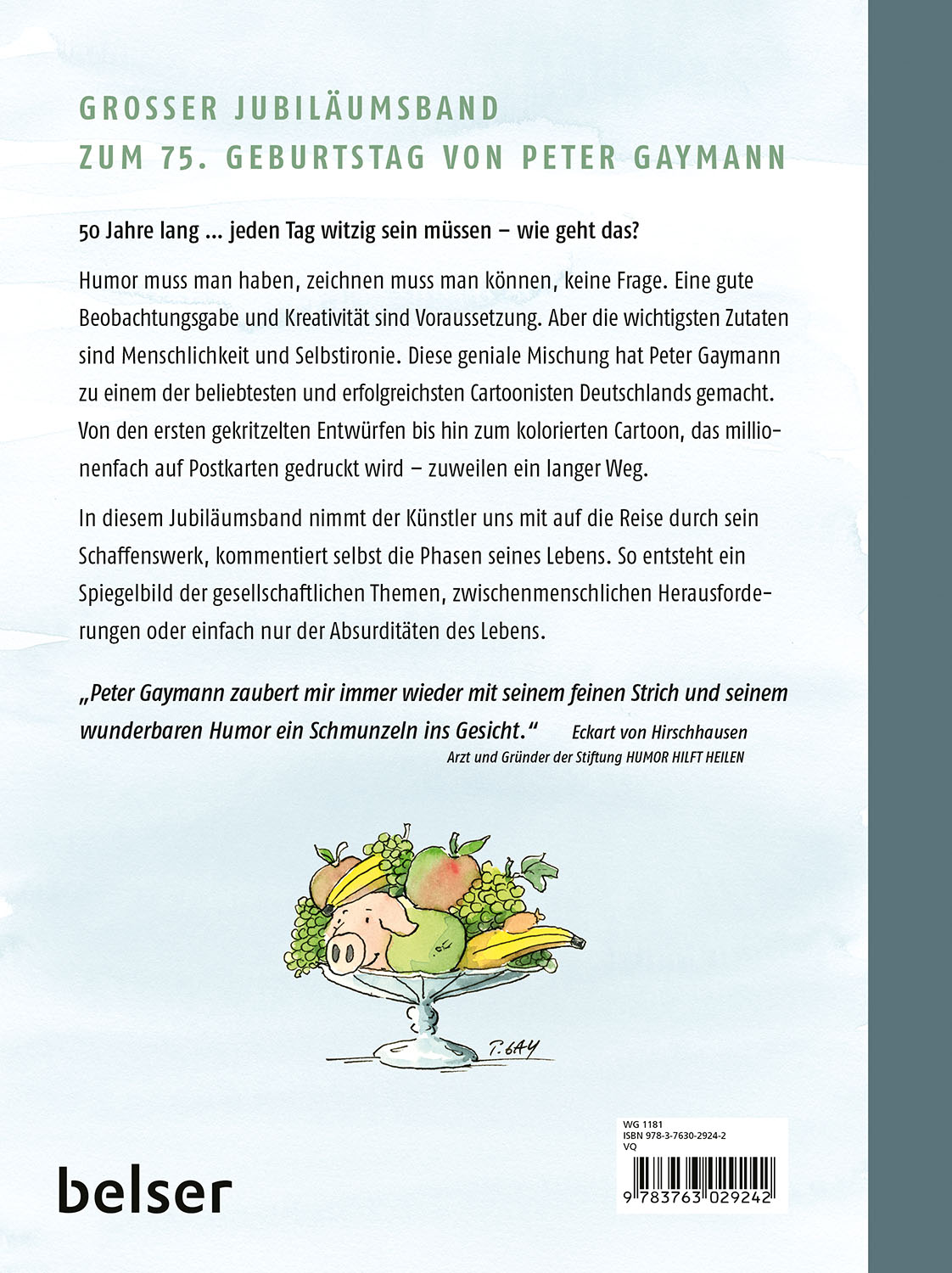 Das Leben ist schön – aber nur, wenn’s auch was zu lachen gibt! Und genau dafür sorgt Peter Gaymann: Seit fünf Jahrzehnten nimmt er uns alle mit seinen witzig-komischen Cartoons aufs Korn: ob Beziehungsstress, Gesundheitskult oder Altersmacken. Zielsicher karikiert er mit seinen Hühnern, Katzen, Schweinen, Osterhasen und Nikoläusen die Schwächen und Kuriositäten von Mensch und Gesellschaft. Nichts entgeht seinem scharfen Blick! Auch wenn Peter Gaymann mit Stift und Pinsel satirisch zuspitzt und überzeichnet, zeigen die Motive immer den liebevollen Blick des Zeichners auf seine Charaktere und Figuren.