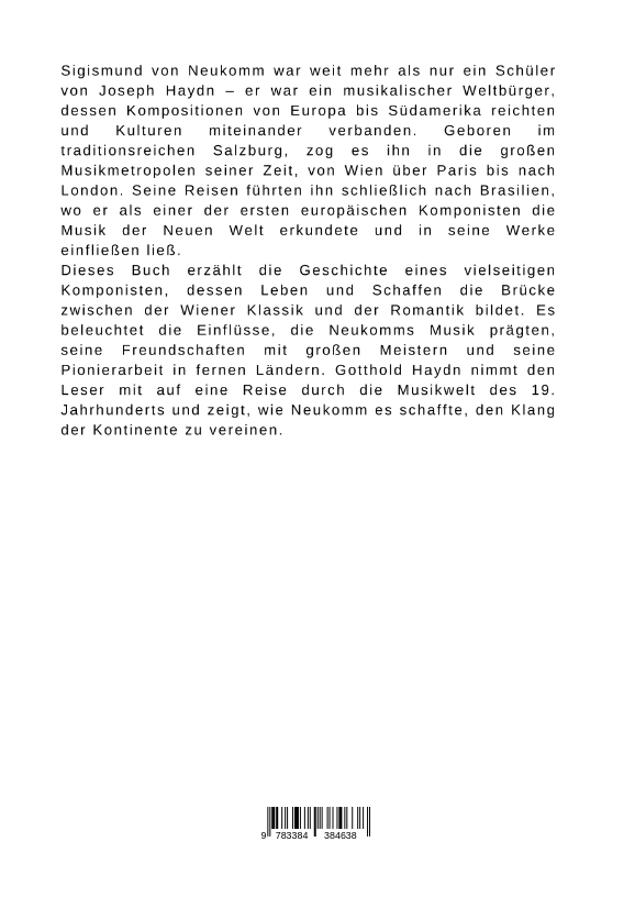 Sigismund von Neukomm war weit mehr als nur ein Schüler von Joseph Haydn - er war ein musikalischer Weltbürger, dessen Kompositionen von Europa bis Südamerika reichten und Kulturen miteinander verbanden. Geboren im traditionsreichen Salzburg, zog es ihn in die großen Musikmetropolen seiner Zeit, von Wien über Paris bis nach London. Seine Reisen führten ihn schließlich nach Brasilien, wo er als einer der ersten europäischen Komponisten die Musik der Neuen Welt erkundete und in seine Werke einfließen ließ.Dieses Buch erzählt die Geschichte eines vielseitigen Komponisten, dessen Leben und Schaffen die Brücke zwischen der Wiener Klassik und der Romantik bildet. Es beleuchtet die Einflüsse, die Neukomms Musik prägten, seine Freundschaften mit großen Meistern und seine Pionierarbeit in fernen Ländern. Gotthold Haydn nimmt den Leser mit auf eine Reise durch die Musikwelt des 19. Jahrhunderts und zeigt, wie Neukomm es schaffte, den Klang der Kontinente zu vereinen.