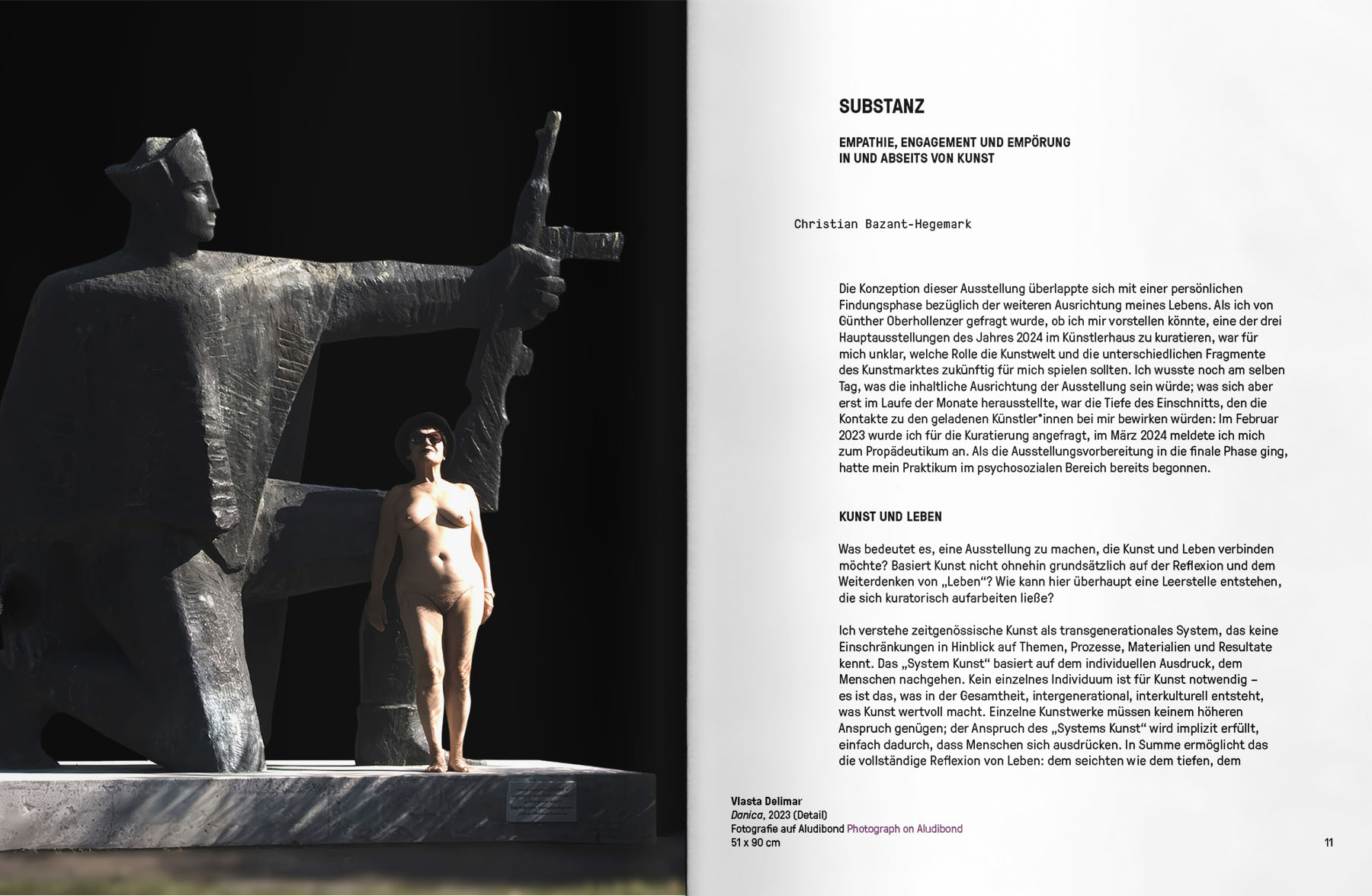 Die Ausstellung Substanz - Empathie, Engagement und Empörung in und abseits von Kunst verweist auf die Basis, aus der wir entstehen: unsere Menschlichkeit, unsere soziale Eingebundenheit und unseren Willen, zu gestalten und so das eigene Selbst mit seiner individuellen Positionierung in die Welt zu tragen. In exemplarischer Herangehensweise stellt die Ausstellung nationale wie internationale Kunstschaffende und Kulturakteur*innen vor, die in ihrer Produktion und/oder in privaten Initiativen gesellschaftlich handeln. Mit ihrer Kunst und ihrem Engagement möchten sie Wissen vermitteln und emotionale Prozesse anregen - sie wollen aufrütteln, Trost spenden und Hoffnung geben. So bilden einige Künstler*innen Communities, rufen Kampagnen ins Leben oder initiieren Förderprojekte. Andere nutzen ihre spezifische künstlerische Ausdrucksweise, um die Öffentlichkeit für dringliche Themen zu sensibilisieren, in Dialog zu treten oder selbst Position zu beziehen.