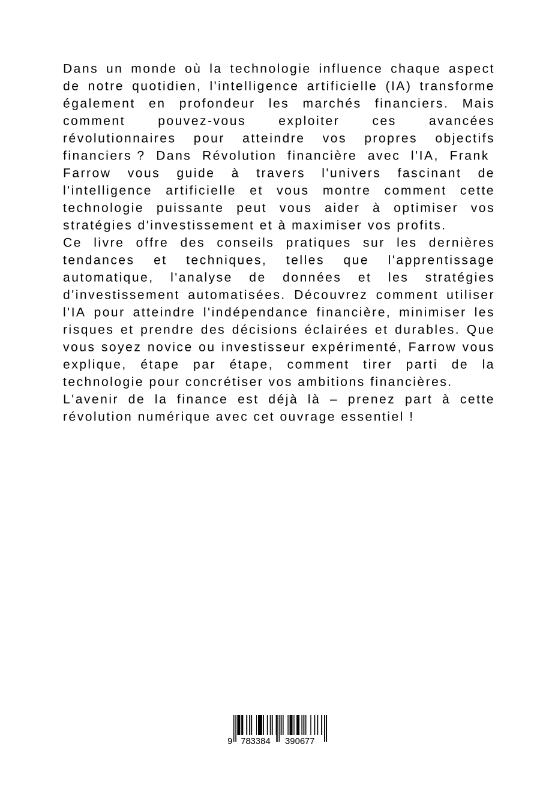 Dans un monde où la technologie influence chaque aspect de notre quotidien, l'intelligence artificielle (IA) transforme également en profondeur les marchés financiers. Mais comment pouvez-vous exploiter ces avancées révolutionnaires pour atteindre vos propres objectifs financiers ? Dans Révolution financière avec l'IA, Frank Farrow vous guide à travers l'univers fascinant de l'intelligence artificielle et vous montre comment cette technologie puissante peut vous aider à optimiser vos stratégies d'investissement et à maximiser vos profits.Ce livre offre des conseils pratiques sur les dernières tendances et techniques, telles que l'apprentissage automatique, l'analyse de données et les stratégies d'investissement automatisées. Découvrez comment utiliser l'IA pour atteindre l'indépendance financière, minimiser les risques et prendre des décisions éclairées et durables. Que vous soyez novice ou investisseur expérimenté, Farrow vous explique, étape par étape, comment tirer parti de la technologie pour concrétiser vos ambitions financières.L'avenir de la finance est déjà là - prenez part à cette révolution numérique avec cet ouvrage essentiel !