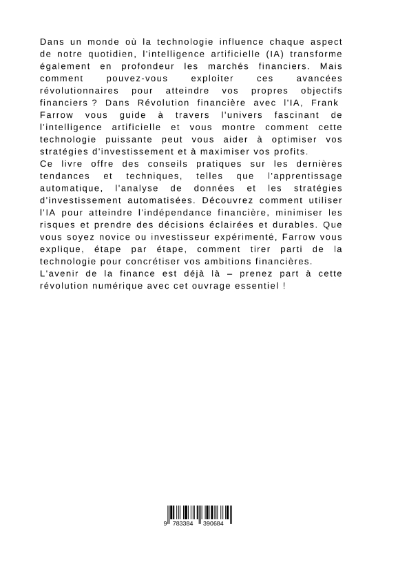 Dans un monde où la technologie influence chaque aspect de notre quotidien, l'intelligence artificielle (IA) transforme également en profondeur les marchés financiers. Mais comment pouvez-vous exploiter ces avancées révolutionnaires pour atteindre vos propres objectifs financiers ? Dans Révolution financière avec l'IA, Frank Farrow vous guide à travers l'univers fascinant de l'intelligence artificielle et vous montre comment cette technologie puissante peut vous aider à optimiser vos stratégies d'investissement et à maximiser vos profits.Ce livre offre des conseils pratiques sur les dernières tendances et techniques, telles que l'apprentissage automatique, l'analyse de données et les stratégies d'investissement automatisées. Découvrez comment utiliser l'IA pour atteindre l'indépendance financière, minimiser les risques et prendre des décisions éclairées et durables. Que vous soyez novice ou investisseur expérimenté, Farrow vous explique, étape par étape, comment tirer parti de la technologie pour concrétiser vos ambitions financières.L'avenir de la finance est déjà là - prenez part à cette révolution numérique avec cet ouvrage essentiel !