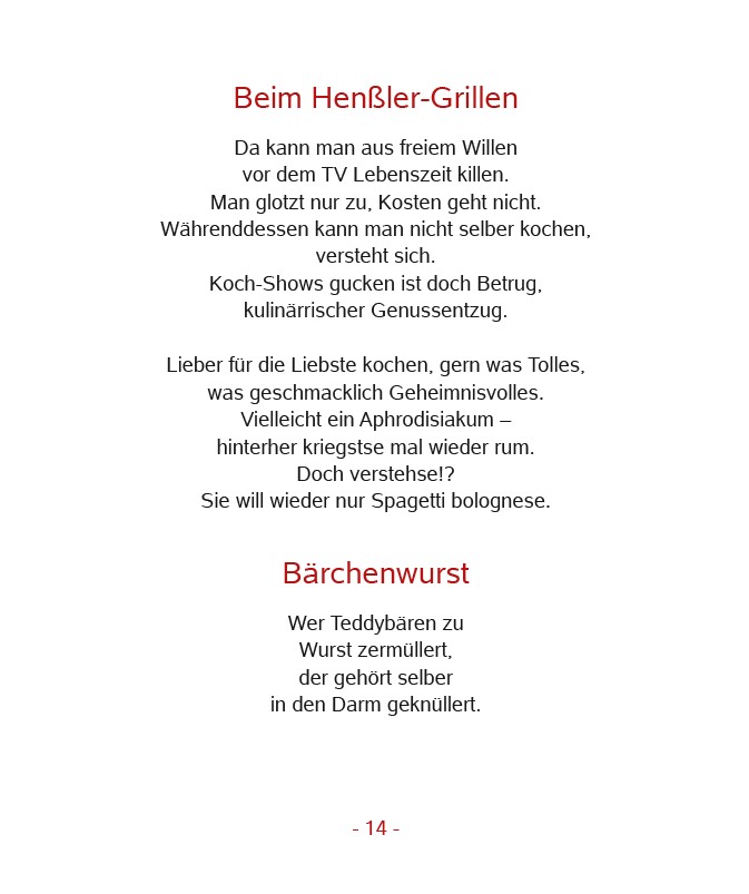 | Schlagworte | Backen • Essen • Gedichte • Humor • Kochen • Kochgedichte • Küchenlieder • Kulinarische Gedichte • Lyrik • Trinken |