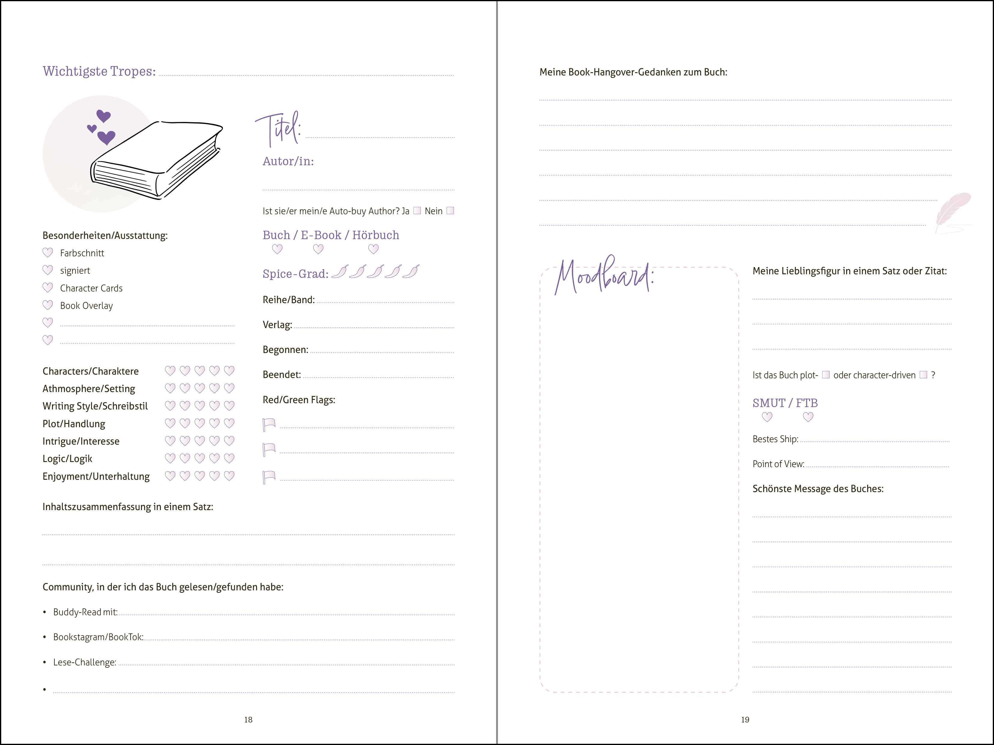 - Mit Platz für 55 Bücher: Gestalte eine Doppelseite für jedes deiner gelesenen Bücher, mit ihren schönsten Messages, wichtigsten Tropes und deinen liebsten Gedanken.