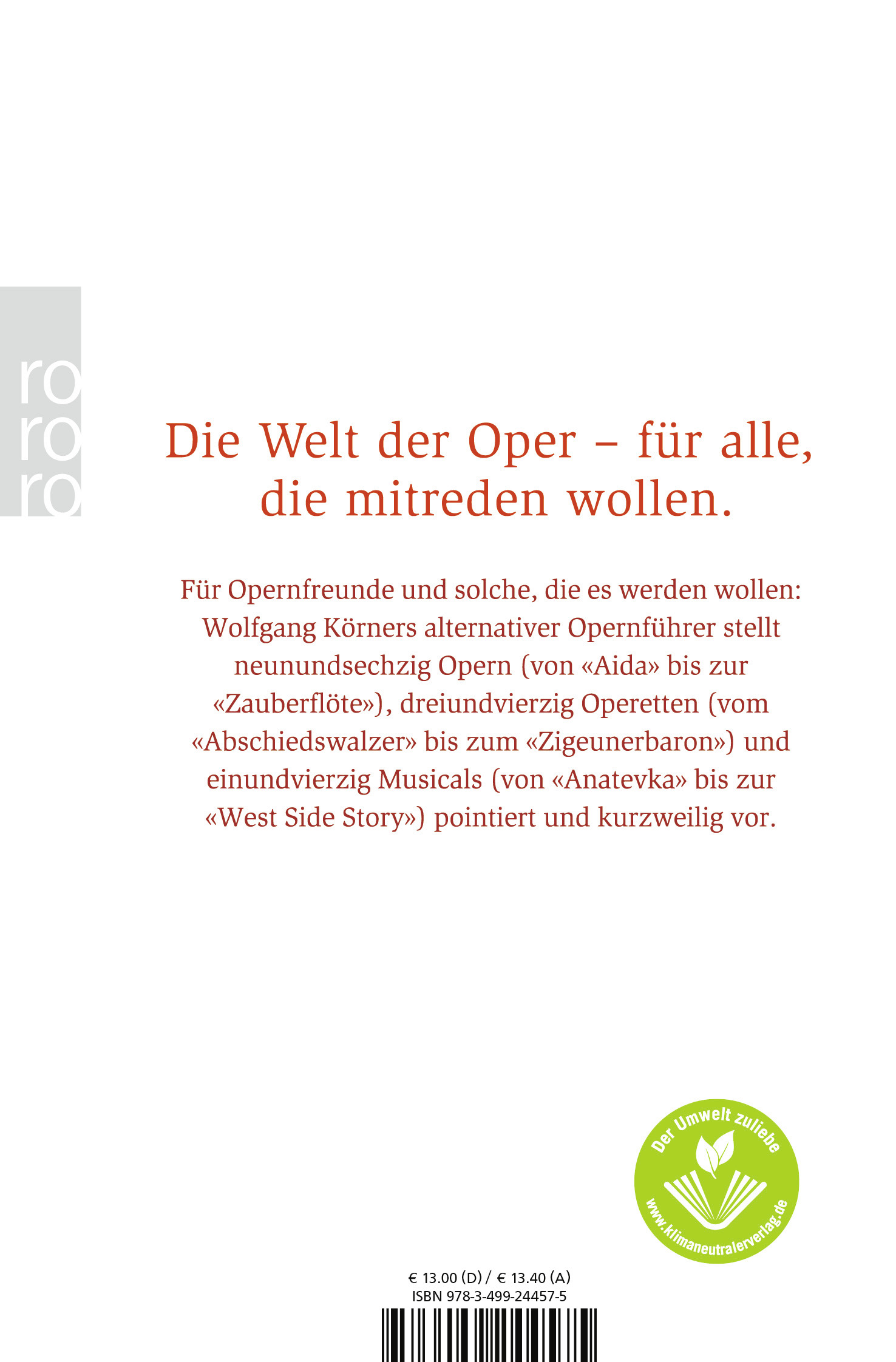 Für Operfreunde und solche, die es werden wollen: Wolfgang Körners alternativer Opernführer stellt neunundsechzig Opern (von "Aida" bis zur "Zauberflöte"), dreiundvierzig Operetten (vom "Abschiedswalzer" bis zum "Zigeunerbaron") und einundvierzig Musicals (von "Anatevka" bis zur "West Side Story") pointiert und kurzweilig vor.