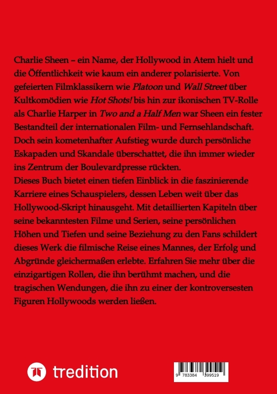 Charlie Sheen - ein Name, der Hollywood in Atem hielt und die Öffentlichkeit wie kaum ein anderer polarisierte. Von gefeierten Filmklassikern wie Platoon und Wall Street über Kultkomödien wie Hot Shots! bis hin zur ikonischen TV-Rolle als Charlie Harper in Two and a Half Men war Sheen ein fester Bestandteil der internationalen Film- und Fernsehlandschaft. Doch sein kometenhafter Aufstieg wurde durch persönliche Eskapaden und Skandale überschattet, die ihn immer wieder ins Zentrum der Boulevardpresse rückten.Dieses Buch bietet einen tiefen Einblick in die faszinierende Karriere eines Schauspielers, dessen Leben weit über das Hollywood-Skript hinausgeht. Mit detaillierten Kapiteln über seine bekanntesten Filme und Serien, seine persönlichen Höhen und Tiefen und seine Beziehung zu den Fans schildert dieses Werk die filmische Reise eines Mannes, der Erfolg und Abgründe gleichermaßen erlebte. Erfahren Sie mehr über die einzigartigen Rollen, die ihn berühmt machen, und die tragischen Wendungen, die ihn zu einer der kontroversesten Figuren Hollywoods werden ließen.
