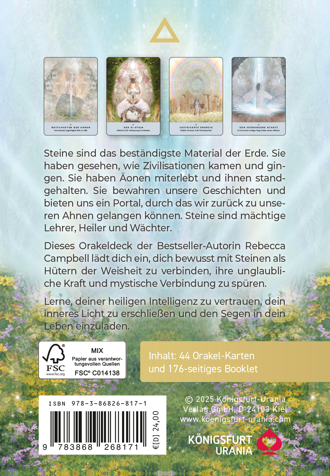 Steine sind das beständigste Material der Erde. Sie haben gesehen, wie Zivilisationen kamen undgingen. Sie haben Äonen miterlebt und ihnen standgehalten. Sie bewahren unsere Geschichtenund bieten uns ein Portal, durch das wir zurück zu unseren Ahnen gelangen können. Steinesind mächtige Lehrer, Heiler und Wächter.Dieses Orakeldeck der Bestseller-Autorin Rebecca Campbell lädt dich ein, dich bewusstmit Steinen als Hütern der Weisheit zu verbinden, ihre unglaubliche Kraft und mystischeVerbindung zu spüren.Lerne, deiner heiligen Intelligenz zu vertrauen, dein inneres Licht zu erschließen und den Segenin dein Leben einzuladen.-Box: Stülpdeckelschachtel mit Goldfolie,144 x 104 x 40 mmKarten: 44 Karten, 95 x 138 mm