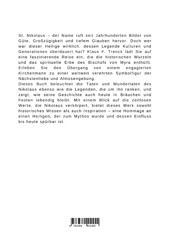 St. Nikolaus - der Name ruft seit Jahrhunderten Bilder von Güte, Großzügigkeit und tiefem Glauben hervor. Doch wer war dieser Heilige wirklich, dessen Legende Kulturen und Generationen überdauert hat? Klaus F. Trenck lädt Sie auf eine faszinierende Reise ein, die die historischen Wurzeln und das spirituelle Erbe des Bischofs von Myra enthüllt. Erleben Sie den Übergang von einem engagierten Kirchenmann zu einer weltweit verehrten Symbolfigur der Nächstenliebe und Almosengebung.Dieses Buch beleuchtet die Taten und Wundertaten des Nikolaus ebenso wie die Legenden, die um ihn ranken, und zeigt, wie seine Geschichte auch heute in Bräuchen und Festen lebendig bleibt. Mit einem Blick auf die zeitlosen Werte, die Nikolaus verkörpert, bietet dieses Werk sowohl historisches Wissen als auch Inspiration - eine Hommage an einen Heiligen, der zum Mythos wurde und dessen Einfluss bis heute spürbar ist.