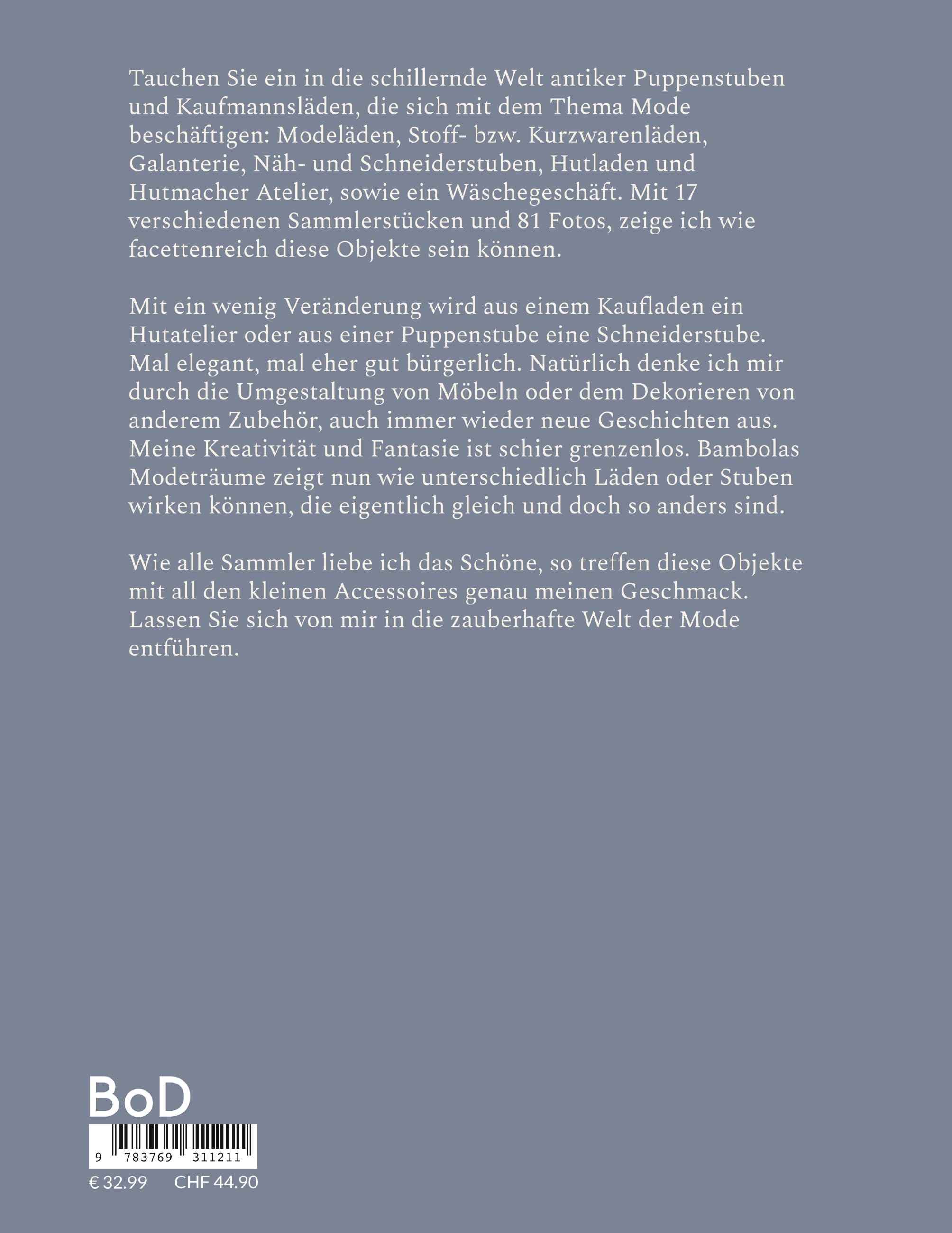Tauchen Sie ein in die schillernde Welt antiker Puppenstuben und Kaufmannsläden, die sich mit dem Thema Mode beschäftigen: Modeläden, Stoff- bzw. Kurzwarenläden, Galanterie, Näh- und Schneiderstuben, Hutladen und Hutmacher Atelier, sowie ein Wäschegeschäft. Mit 17 verschiedenen Sammlerstücken und 81 Fotos, zeige ich wie facettenreich diese Objekte sein können.