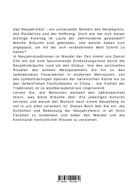 Das Neujahrsfest - ein universeller Moment des Neubeginns, des Rückblicks und der Hoffnung. Doch wie hat sich dieser wichtige Feiertag im Laufe der Jahrhunderte gewandelt? Welche Bräuche sind geblieben, und welche haben sich angepasst, um mit der sich verändernden Welt Schritt zu halten?In Neujahrstraditionen im Wandel der Zeit nimmt uns Daniel Cho mit auf eine faszinierende Entdeckungsreise durch die Neujahrsbräuche rund um den Globus. Von den spirituellen Ritualen des antiken Mesopotamiens bis hin zu den spektakulären Feuerwerken in modernen Metropolen; von den symbolträchtigen Speisen der italienischen Küche bis zu den farbenfrohen Festlichkeiten in China - die Vielfalt der Traditionen ist so atemberaubend wie inspirierend.Lernen Sie, wie Menschen weltweit den Jahreswechsel feiern, was diese Bräuche über ihre jeweiligen Kulturen verraten und warum der Wunsch nach einem Neuanfang so tief in uns allen verankert ist. Dieses Buch lädt Sie ein, die Schönheit und Bedeutung der Neujahrsfeiern in all ihren Facetten zu entdecken und dabei den Wandel und die Kontinuität menschlicher Rituale zu verstehen.