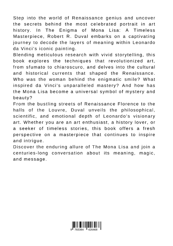 Step into the world of Renaissance genius and uncover the secrets behind the most celebrated portrait in art history. In The Enigma of Mona Lisa: A Timeless Masterpiece, Robert R. Duval embarks on a captivating journey to decode the layers of meaning within Leonardo da Vinci's iconic painting.Blending meticulous research with vivid storytelling, this book explores the techniques that revolutionized art, from sfumato to chiaroscuro, and delves into the cultural and historical currents that shaped the Renaissance. Who was the woman behind the enigmatic smile? What inspired da Vinci's unparalleled mastery? And how has the Mona Lisa become a universal symbol of mystery and beauty?From the bustling streets of Renaissance Florence to the halls of the Louvre, Duval unveils the philosophical, scientific, and emotional depth of Leonardo's visionary art. Whether you are an art enthusiast, a history lover, or a seeker of timeless stories, this book offers a fresh perspective on a masterpiece that continues to inspire and intrigue.Discover the enduring allure of The Mona Lisa and join a centuries-long conversation about its meaning, magic, and message.