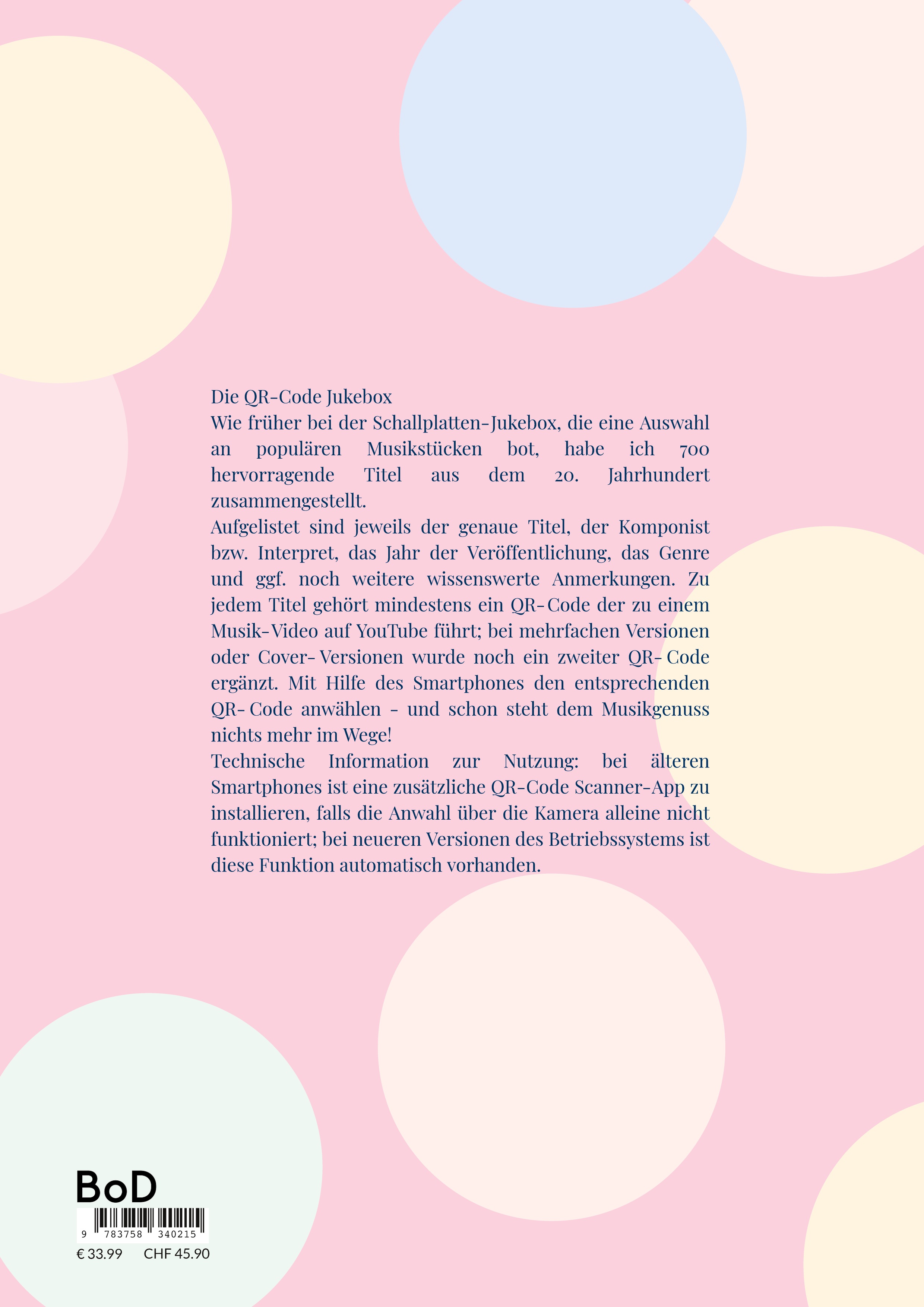 Aufgelistet sind jeweils der genaue Titel, der Komponist bzw. Interpret, das Jahr der Veröffentlichung, das Genre und ggf. noch weitere wissenswerte Anmerkungen. Zu jedem Titel gehört mindestens ein QR-Code der zu einem Musik-Video auf YouTube führt; bei mehrfachen Versionen oder Cover-Versionen wurde noch ein zweiter QR-Code ergänzt. Mit Hilfe des Smartphones den entsprechenden QR-Code anwählen - und schon steht dem Musikgenuss nichts mehr im Wege!