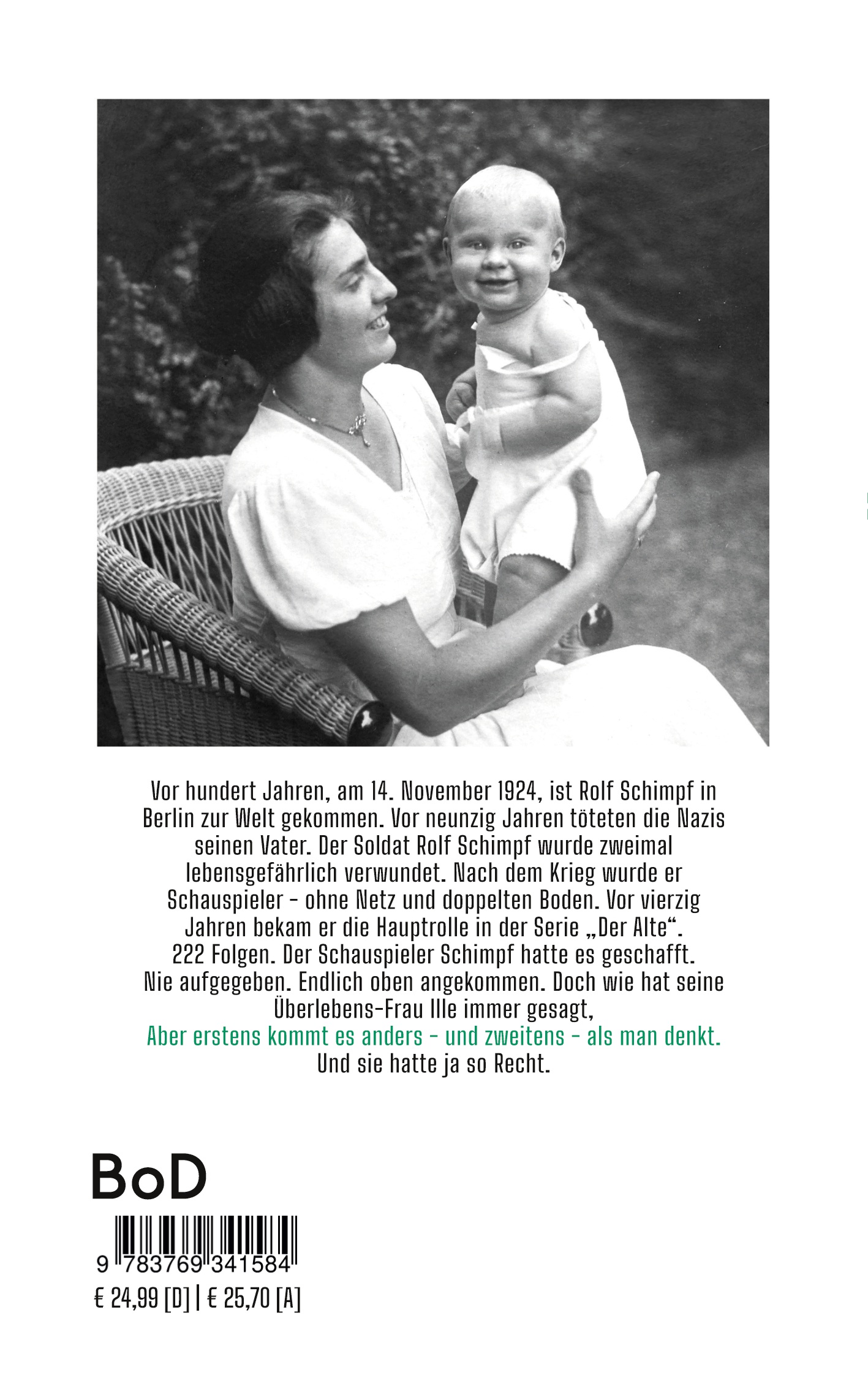 Vor hundert Jahren, am 14. November 1924, ist Rolf Schimpf in Berlin zur Welt gekommen. Vor neunzig Jahren töteten die Nazis seinen Vater. Der Soldat Rolf Schimpf wurde zweimal lebensgefährlich verwundet. Nach dem Krieg wurde er Schauspieler - ohne Netz und doppelten Boden. Vor vierzig Jahren bekam er die Hauptrolle in der Serie "Der Alte". 222 Folgen. Der Schauspieler Schimpf hatte es geschafft. Nie aufgegeben, Endlich oben angekommen. Doch wie hat seine Überlebens-Frau Ille immer gesagt: