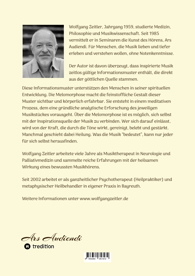 Wolfgang Zeitler, geb. 1959, studierte Medizin und Philosophie und arbeitete nach einer musikwissenschaftlichen Ausbildung viele Jahre als Musiktherapeut in der neurologischen Frührehabilitation mit Wachkoma-Patienten, später auf einer Palliativstation. Zahlreiche Weiterbildungen im Bereich ganzheitliche Psychotherapie, metaphysische und schamanische Heilweisen. Seit 2002 eigene Heilpraxis (Heilpraktiker Psychotherapie) in Bayreuth. Er leitet seit 1985 Seminare zur Heilkunst des Hörens, Ars Audiendi, initiatische Musikmeditation. Die Offenbarungen der Musik haben ihn reich beschenkt und wiederholt verwandelt. Sein tiefstes Anliegen ist, die Menschen wieder zu einem tieferen Erleben und Erkennen der großen, inspirierten Musik zu führen. Für ihn spricht durch solche Töne die göttliche SOPHIA. Musik ist die reinste Sprache des Geistes und braucht nicht übersetzt zu werden! Es ist aber notwendig, das Ohr zu öffnen, das wirkliche Hören zu lernen und zu üben. Mittels der Melomorphose wird die feinstoffliche Gestalt eines Musikstückes körperlich erfahrbar. Auf dem Wege des Übens und der Meditation kann jeder, der sich darauf einlässt, ein tiefes Einswerden mit der Musik erfahren. So öffnet sich durch die Musik selbst eine Verbindung zur göttlichen Quelle. Der Autor blickt inzwischen auf 40 Jahre spirituelle Entwicklung und Wahrnehmung der Musik in der Gesellschaft. Dabei wird deutlich, wie raffiniert die Menschen von einem solchen Zugang zu inspirierter Musik ferngehalten werden. Es ist heute völlig "out", Klassische Musik als etwas hoch Spirituelles anzusehen. Uralte Klangphänomene, wie Klangschalen, Gongs und Obertongesang, gelten in spirituellen Kreisen als Nonplusultra. Dies ist Musik aus den archaischen, magischen und mythischen Bewusstseinsepochen. Doch die Menschheit hat sich weiterentwickelt. Aktuell leben wir am Ende der rationalen Bewusstseinsepoche, und am Beginn eines neuen, integralen Bewusstseins. Aus der Akasha-Chronik ist bekannt, dass in der Musik, die in der rationalen Bewusstseinsepoche auf die Erde kommt, hochschwingende Informationsmuster feinstofflich gespeichert sind. Diese Schwingungsmuster sollen den Menschen in seiner Entwicklung zum neuen Bewusstsein unterstützen und den alten Menschen heilen. Der Autor will das, was er erfahren und verstanden hat und die Früchte seiner Forschung allgemein zugänglich machen, bevor seine Lebenszeit zu Ende ist. Weitere Informationen unter www.wolfgangzeitler.de