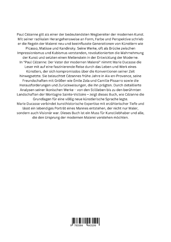 Paul Cézanne gilt als einer der bedeutendsten Wegbereiter der modernen Kunst. Mit seiner radikalen Herangehensweise an Form, Farbe und Perspektive schrieb er die Regeln der Malerei neu und beeinflusste Generationen von Künstlern wie Picasso, Matisse und Kandinsky. Seine Werke, oft als Brücke zwischen Impressionismus und Kubismus verstanden, revolutionierten die Wahrnehmung der Kunst und setzten einen Meilenstein in der Entwicklung der Moderne.In "Paul Cézanne: Der Vater der modernen Malerei" nimmt Marie Ducasse die Leser mit auf eine faszinierende Reise durch das Leben und Werk eines Künstlers, der sich kompromisslos über die Konventionen seiner Zeit hinwegsetzte. Sie beleuchtet Cézannes frühe Jahre in Aix-en-Provence, seine Freundschaften mit Größen wie Émile Zola und Camille Pissarro sowie die Herausforderungen und Zurückweisungen, die ihn prägten. Durch detaillierte Analysen seiner ikonischen Werke - von den Stillleben bis zu den berühmten Landschaften der Montagne Sainte-Victoire - zeigt dieses Buch, wie Cézanne die Grundlagen für eine völlig neue künstlerische Sprache legte.Marie Ducasse verbindet kunsthistorische Expertise mit erzählerischer Tiefe und lässt ein lebendiges Porträt eines Mannes entstehen, der nicht nur Maler, sondern auch Visionär war. Dieses Buch ist ein Muss für Kunstliebhaber und alle, die den Ursprung der modernen Malerei verstehen möchten.