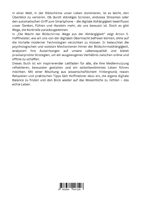 In einer Welt, in der Bildschirme unser Leben dominieren, ist es leicht, den Überblick zu verlieren. Ob durch ständiges Scrollen, endloses Streamen oder den automatischen Griff zum Smartphone - die digitale Abhängigkeit beeinflusst unser Denken, Fühlen und Handeln mehr, als uns bewusst ist. Doch es gibt Wege, die Kontrolle zurückzugewinnen.In "Die Macht der Bildschirme: Wege aus der Abhängigkeit" zeigt Anton S. Hoffmeister, wie wir uns von der digitalen Übermacht befreien können, ohne auf die Vorteile moderner Technologien verzichten zu müssen. Er beleuchtet die psychologischen und sozialen Mechanismen hinter der Bildschirmabhängigkeit, analysiert ihre Auswirkungen auf unsere Lebensqualität und bietet praxiserprobte Strategien, um ein ausgewogenes Verhältnis zwischen online und offline zu schaffen.Dieses Buch ist ein inspirierender Leitfaden für alle, die ihre Mediennutzung reflektieren, bewusster gestalten und ein selbstbestimmtes Leben führen möchten. Mit einer Mischung aus wissenschaftlichem Hintergrund, realen Beispielen und praktischen Tipps lädt Hoffmeister dazu ein, die eigene digitale Balance zu finden und den Blick wieder auf das Wesentliche zu richten - das echte Leben.