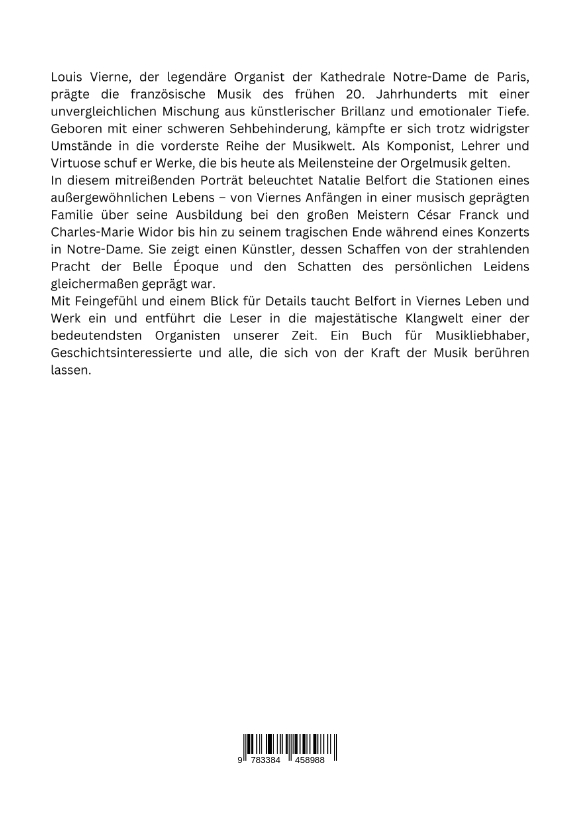 Louis Vierne, der legendäre Organist der Kathedrale Notre-Dame de Paris, prägte die französische Musik des frühen 20. Jahrhunderts mit einer unvergleichlichen Mischung aus künstlerischer Brillanz und emotionaler Tiefe. Geboren mit einer schweren Gehbehinderung, kämpfte er sich trotz widrigster Umstände in die vorderste Reihe der Musik-welt. Als Komponist, Lehrer und Virtuose schuf er Werke, die bis heute als Meilensteine der Orgelmusik gelten.In diesem mitreißenden Porträt beleuchtet Natalie Belfort die Stationen eines außergewöhnlichen Lebens - von Viernes Anfängen in einer musisch geprägten Familie über sei-ne Ausbildung bei den großen Meistern César Franck und Charles-Marie Widor bis hin zu seinem tragischen Ende während eines Konzerts in Notre-Dame. Sie zeigt einen Künstler, dessen Schaffen von der strahlenden Pracht der Belle Époque und den Schatten des persönlichen Leidens gleichermaßen geprägt war.Mit Feingefühl und einem Blick für Details taucht Belfort in Viernes Leben und Werk ein und entführt die Leser in die majestätische Klangwelt einer der bedeutendsten Organisten unserer Zeit. Ein Buch für Musikliebhaber, Geschichtsinteressierte und alle, die sich von der Kraft der Musik berühren lassen.