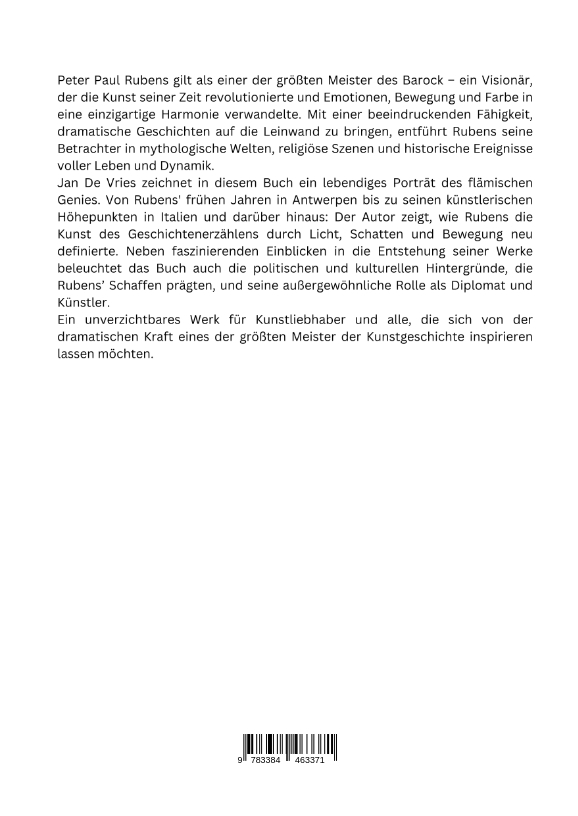 Peter Paul Rubens gilt als einer der größten Meister des Barock - ein Visionär, der die Kunst seiner Zeit revolutionierte und Emotionen, Bewegung und Farbe in eine einzigartige Harmonie verwandelte. Mit einer beeindruckenden Fähigkeit, dramatische Geschichten auf die Leinwand zu bringen, entführt Rubens seine Betrachter in mythologische Welten, religiöse Szenen und historische Ereignisse voller Leben und Dynamik.Jan De Vries zeichnet in diesem Buch ein lebendiges Porträt des flämischen Genies. Von Rubens' frühen Jahren in Antwerpen bis zu seinen künstlerischen Höhepunkten in Italien und darüber hinaus: Der Autor zeigt, wie Rubens die Kunst des Geschichtenerzählens durch Licht, Schatten und Bewegung neu definierte. Neben faszinierenden Einblicken in die Entstehung seiner Werke beleuchtet das Buch auch die politischen und kulturellen Hintergründe, die Rubens' Schaffen prägten, und seine außergewöhnliche Rolle als Diplomat und Künstler.Ein unverzichtbares Werk für Kunstliebhaber und alle, die sich von der dramatischen Kraft eines der größten Meister der Kunstgeschichte inspirieren lassen möchten.