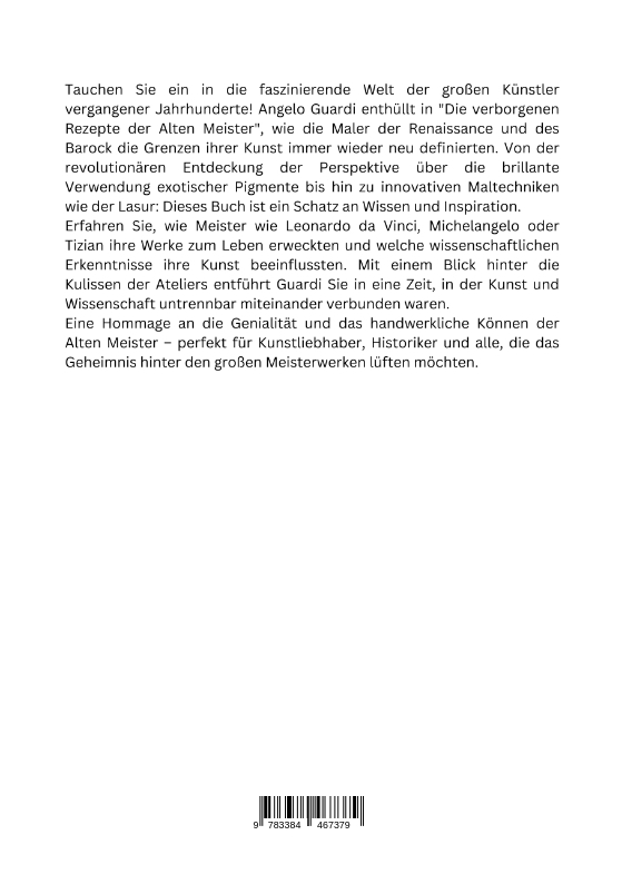 Tauchen Sie ein in die faszinierende Welt der großen Künstler vergangener Jahrhunderte! Angelo Guardi enthüllt in "Die verborgenen Rezepte der Alten Meister", wie die Maler der Renaissance und des Barock die Grenzen ihrer Kunst immer wieder neu definierten. Von der revolutionären Entdeckung der Perspektive über die brillante Verwendung exotischer Pigmente bis hin zu innovativen Maltechniken wie der Lasur: Dieses Buch ist ein Schatz an Wissen und Inspiration.Erfahren Sie, wie Meister wie Leonardo da Vinci, Michelangelo oder Tizian ihre Werke zum Leben erweckten und welche wissenschaftlichen Erkenntnisse ihre Kunst beeinflussten. Mit einem Blick hinter die Kulissen der Ateliers entführt Guardi Sie in eine Zeit, in der Kunst und Wissenschaft untrennbar miteinander verbunden waren.Eine Hommage an die Genialität und das handwerkliche Können der Alten Meister - per-fekt für Kunstliebhaber, Historiker und alle, die das Geheimnis hinter den großen Meisterwerken lüften möchten.