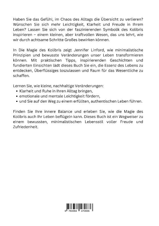 Haben Sie das Gefühl, im Chaos des Alltags die Übersicht zu verlieren? Wünschen Sie sich mehr Leichtigkeit, Klarheit und Freude in Ihrem Leben? Lassen Sie sich von der faszinierenden Symbolik des Kolibris inspirieren - einem kleinen, aber kraftvollen Wesen, das uns lehrt, wie wir durch achtsame Schritte Großes bewirken können.In Die Magie des Kolibris zeigt Jennifer Linford, wie minimalistische Prinzipien und bewusste Veränderungen unser Leben transformieren können. Mit praktischen Tipps, inspirierenden Geschichten und fundierten Einsichten lädt dieses Buch Sie ein, die Essenz des Lebens zu entdecken, Überflüssiges loszulassen und Raum für das Wesentliche zu schaffen.Lernen Sie, wie kleine, nachhaltige Veränderungen:Klarheit und Ruhe in Ihren Alltag bringen,emotionale und mentale Leichtigkeit fördern,und Sie auf den Weg zu einem erfüllten, authentischen Leben führen.Finden Sie Ihre innere Balance und erleben Sie, wie die Magie des Kolibris auch Ihr Leben beflügeln kann. Dieses Buch ist ein Wegweiser zu einem bewussten, minimalistischen Lebensstil voller Freude und Zufriedenheit.