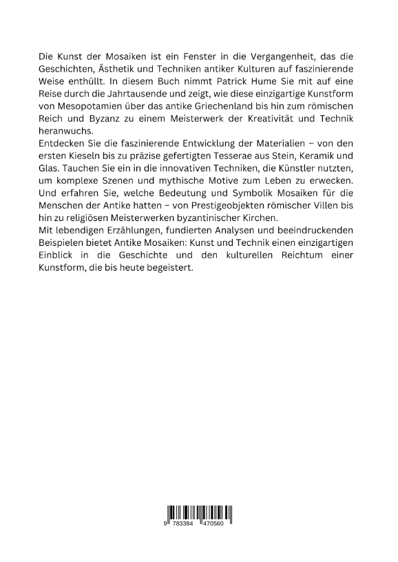 Die Kunst der Mosaiken ist ein Fenster in die Vergangenheit, das die Geschichten, Ästhetik und Techniken antiker Kulturen auf faszinierende Weise enthüllt. In diesem Buch nimmt Patrick Hume Sie mit auf eine Reise durch die Jahrtausende und zeigt, wie diese einzigartige Kunstform von Mesopotamien über das antike Griechenland bis hin zum römischen Reich und Byzanz zu einem Meisterwerk der Kreativität und Technik heran-wuchs.Entdecken Sie die faszinierende Entwicklung der Materialien - von den ersten Kieseln bis zu präzise gefertigten Tesserae aus Stein, Keramik und Glas. Tauchen Sie ein in die innovativen Techniken, die Künstler nutzten, um komplexe Szenen und mythische Motive zum Leben zu erwecken. Und erfahren Sie, welche Bedeutung und Symbolik Mosaiken für die Menschen der Antike hatten - von Prestigeobjekten römischer Villen bis hin zu religiösen Meisterwerken byzantinischer Kirchen.Mit lebendigen Erzählungen, fundierten Analysen und beeindruckenden Beispielen bietet Antike Mosaiken: Kunst und Technik einen einzigartigen Einblick in die Geschichte und den kulturellen Reichtum einer Kunstform, die bis heute begeistert.