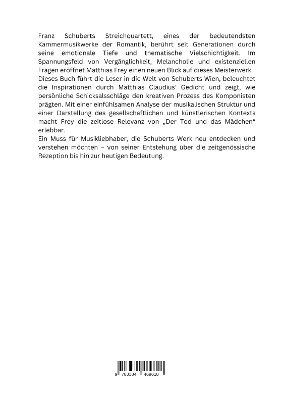 Franz Schuberts Streichquartett, eines der bedeutendsten Kammermusikwerke der Romantik, berührt seit Generationen durch seine emotionale Tiefe und thematische Vielschichtigkeit. Im Spannungsfeld von Vergänglichkeit, Melancholie und existenziellen Fragen eröffnet Matthias Frey einen neuen Blick auf dieses Meisterwerk.Dieses Buch führt die Leser in die Welt von Schuberts Wien, beleuchtet die Inspirationen durch Matthias Claudius' Gedicht und zeigt, wie persönliche Schicksalsschläge den kreativen Prozess des Komponisten prägten. Mit einer einfühlsamen Analyse der musikalischen Struktur und einer Darstellung des gesellschaftlichen und künstlerischen Kontexts macht Frey die zeitlose Relevanz von "Der Tod und das Mädchen" erlebbar.Ein Muss für Musikliebhaber, die Schuberts Werk neu entdecken und verstehen möchten - von seiner Entstehung über die zeitgenössische Rezeption bis hin zur heutigen Bedeutung.