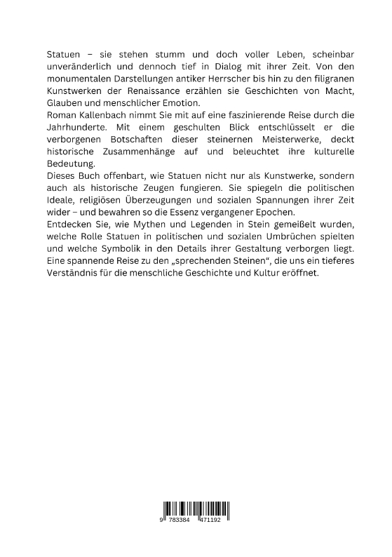 Statuen - sie stehen stumm und doch voller Leben, scheinbar unveränderlich und den-noch tief in Dialog mit ihrer Zeit. Von den monumentalen Darstellungen antiker Herr-scher bis hin zu den filigranen Kunstwerken der Renaissance erzählen sie Geschichten von Macht, Glauben und menschlicher Emotion.Roman Kallenbach nimmt Sie mit auf eine faszinierende Reise durch die Jahrhunderte. Mit einem geschulten Blick entschlüsselt er die verborgenen Botschaften dieser steinernen Meisterwerke, deckt historische Zusammenhänge auf und beleuchtet ihre kulturelle Bedeutung.Dieses Buch offenbart, wie Statuen nicht nur als Kunstwerke, sondern auch als historische Zeugen fungieren. Sie spiegeln die politischen Ideale, religiösen Überzeugungen und sozialen Spannungen ihrer Zeit wider - und bewahren so die Essenz vergangener Epochen.Entdecken Sie, wie Mythen und Legenden in Stein gemeißelt wurden, welche Rolle Statuen in politischen und sozialen Umbrüchen spielten und welche Symbolik in den Details ihrer Gestaltung verborgen liegt. Eine spannende Reise zu den "sprechenden Steinen", die uns ein tieferes Verständnis für die menschliche Geschichte und Kultur eröffnet.