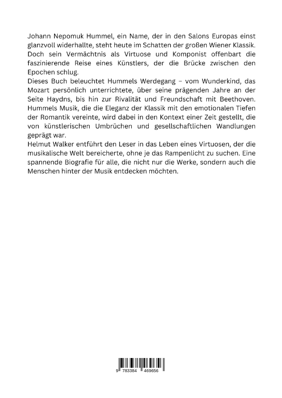 Johann Nepomuk Hummel, ein Name, der in den Salons Europas einst glanzvoll widerhallte, steht heute im Schatten der großen Wiener Klassik. Doch sein Vermächtnis als Virtuose und Komponist offenbart die faszinierende Reise eines Künstlers, der die Brücke zwischen den Epochen schlug.Dieses Buch beleuchtet Hummels Werdegang - vom Wunderkind, das Mozart persönlich unterrichtete, über seine prägenden Jahre an der Seite Haydns, bis hin zur Rivalität und Freundschaft mit Beethoven. Hummels Musik, die die Eleganz der Klassik mit den emotionalen Tiefen der Romantik vereinte, wird dabei in den Kontext einer Zeit gestellt, die von künstlerischen Umbrüchen und gesellschaftlichen Wandlungen geprägt war.Helmut Walker entführt den Leser in das Leben eines Virtuosen, der die musikalische Welt bereicherte, ohne je das Rampenlicht zu suchen. Eine spannende Biografie für alle, die nicht nur die Werke, sondern auch die Menschen hinter der Musik entdecken möchten.