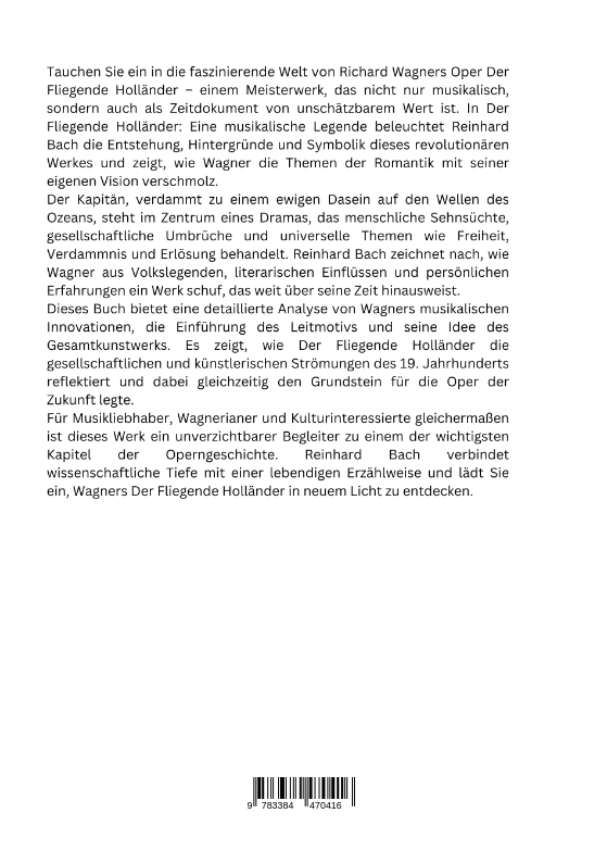 Tauchen Sie ein in die faszinierende Welt von Richard Wagners Oper Der Fliegende Holländer - einem Meisterwerk, das nicht nur musikalisch, sondern auch als Zeitdokument von unschätzbarem Wert ist. In Der Fliegende Holländer: Eine musikalische Legende beleuchtet Reinhard Bach die Entstehung, Hintergründe und Symbolik dieses revolutionären Werkes und zeigt, wie Wagner die Themen der Romantik mit seiner eigenen Vision verschmolz.Der Kapitän, verdammt zu einem ewigen Dasein auf den Wellen des Ozeans, steht im Zentrum eines Dramas, das menschliche Sehnsüchte, gesellschaftliche Umbrüche und universelle Themen wie Freiheit, Verdammnis und Erlösung behandelt. Reinhard Bach zeichnet nach, wie Wagner aus Volkslegenden, literarischen Einflüssen und persönlichen Erfahrungen ein Werk schuf, das weit über seine Zeit hinausweist.Dieses Buch bietet eine detaillierte Analyse von Wagners musikalischen Innovationen, die Einführung des Leitmotivs und seine Idee des Gesamtkunstwerks. Es zeigt, wie Der Fliegende Holländer die gesellschaftlichen und künstlerischen Strömungen des 19. Jahrhunderts reflektiert und dabei gleichzeitig den Grundstein für die Oper der Zukunft legte.Für Musikliebhaber, Wagnerianer und Kulturinteressierte gleichermaßen ist dieses Werk ein unverzichtbarer Begleiter zu einem der wichtigsten Kapitel der Operngeschichte. Reinhard Bach verbindet wissenschaftliche Tiefe mit einer lebendigen Erzählweise und lädt Sie ein, Wagners Der Fliegende Holländer in neuem Licht zu entdecken.