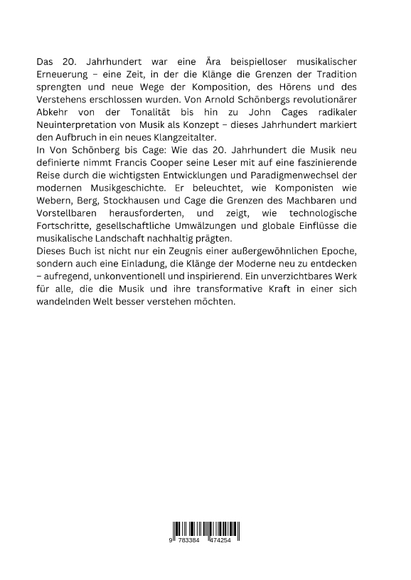 Das 20. Jahrhundert war eine Ära beispielloser musikalischer Erneuerung - eine Zeit, in der die Klänge die Grenzen der Tradition sprengten und neue Wege der Komposition, des Hörens und des Verstehens erschlossen wurden. Von Arnold Schönbergs revolutionärer Abkehr von der Tonalität bis hin zu John Cages radikaler Neuinterpretation von Musik als Konzept - dieses Jahrhundert markiert den Aufbruch in ein neues Klangzeitalter.In Von Schönberg bis Cage: Wie das 20. Jahrhundert die Musik neu definierte nimmt Francis Cooper seine Leser mit auf eine faszinierende Reise durch die wichtigsten Entwicklungen und Paradigmenwechsel der modernen Musikgeschichte. Er beleuchtet, wie Komponisten wie Webern, Berg, Stockhausen und Cage die Grenzen des Machbaren und Vorstellbaren herausforderten, und zeigt, wie technologische Fortschritte, gesellschaftliche Umwälzungen und globale Einflüsse die musikalische Landschaft nachhaltig prägten.Dieses Buch ist nicht nur ein Zeugnis einer außergewöhnlichen Epoche, sondern auch eine Einladung, die Klänge der Moderne neu zu entdecken - aufregend, unkonventionell und inspirierend. Ein unverzichtbares Werk für alle, die die Musik und ihre transformative Kraft in einer sich wandelnden Welt besser verstehen möchten.